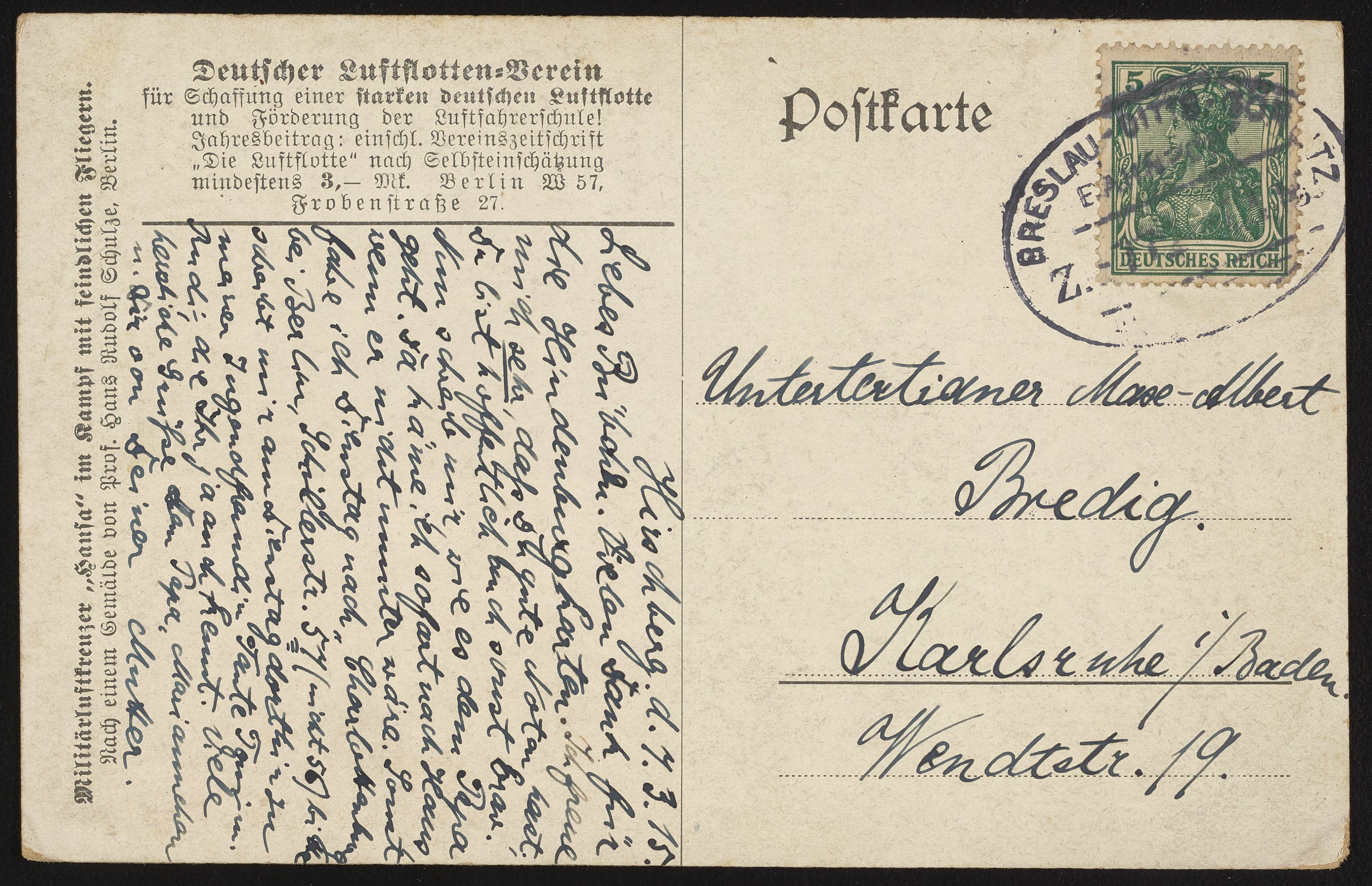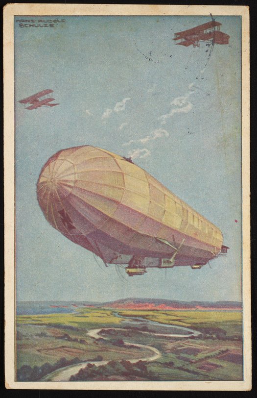 Small JPG1200 x 1856px — 779 KBFull-sized JPG2188 x 3385px — 2.7 MBOriginal fileTIFF — 2188 x 3385px — 21.2 MBPostcard sent to Max Albert Bredig (1902-1977) from his mother, Rosa Bredig (1877-1933). The postcard features a painting of a Zeppelin airship with the Iron Cross by Hans Rudolf Schulze. The postcard was issued by the "Deutscher Luftflotten-Verein" (German Air Fleet Association), which aimed to promote a strong German air fleet and aviation schools.