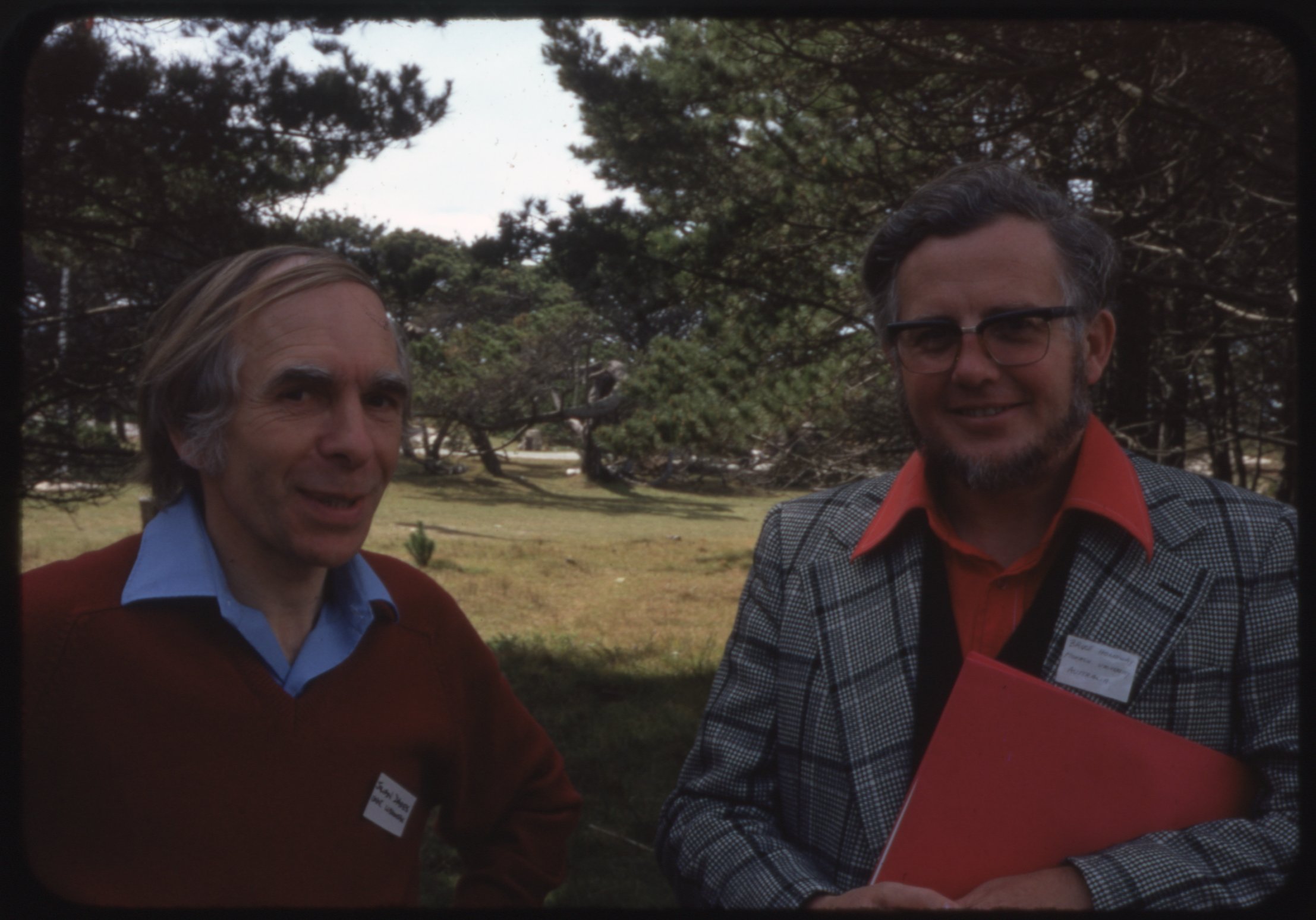 Color transparency of Julian E. Davies (1932-) and Bruce W. Holloway (1928-) attending the 1975 Asilomar Conference.
