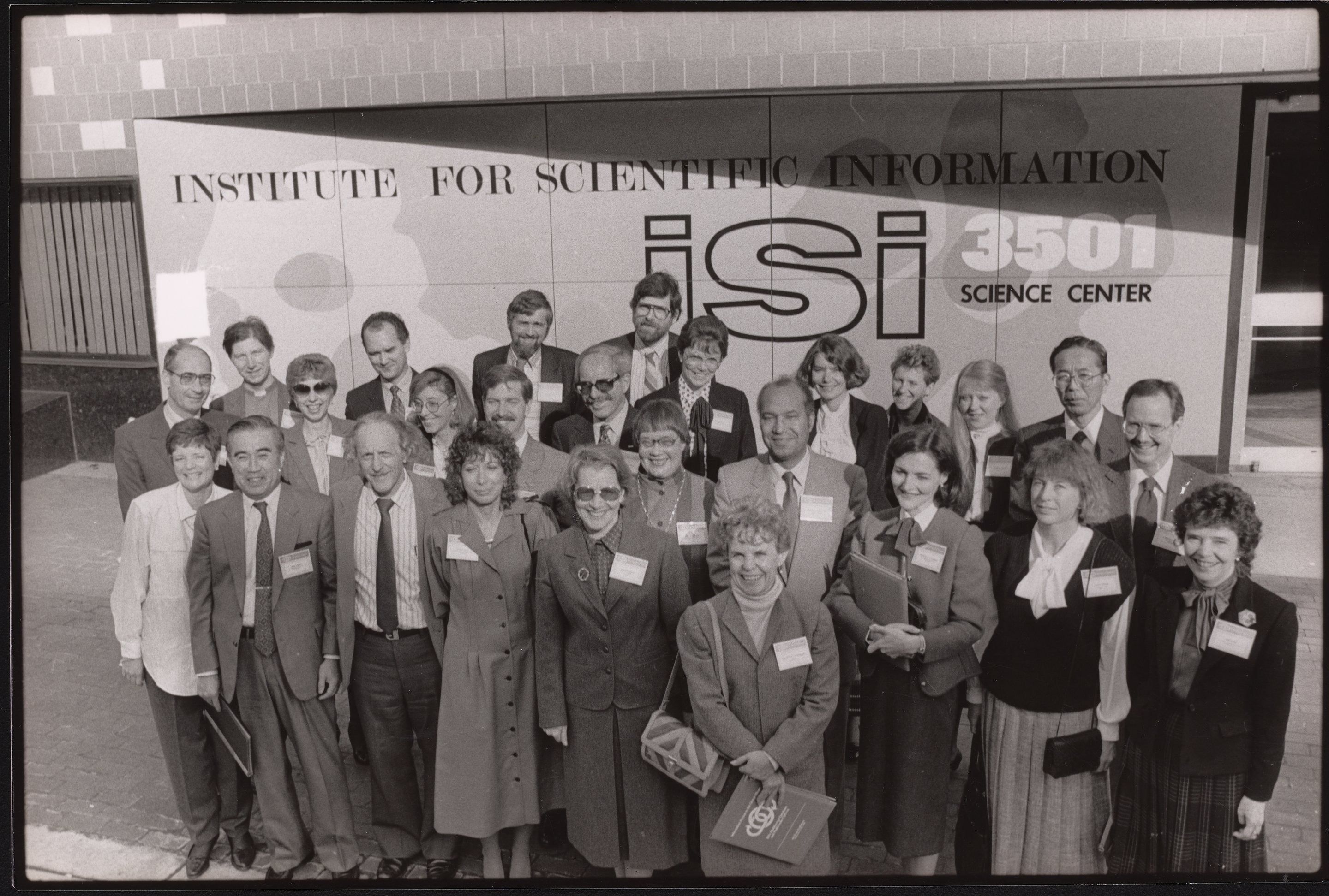 A black and white photograph of a group of twenty-six people standing in front of the Institute for Scientific Information in Philadelphia for a users conference. Eugene Garfield (1925-2017) stands third from the right in the front row.