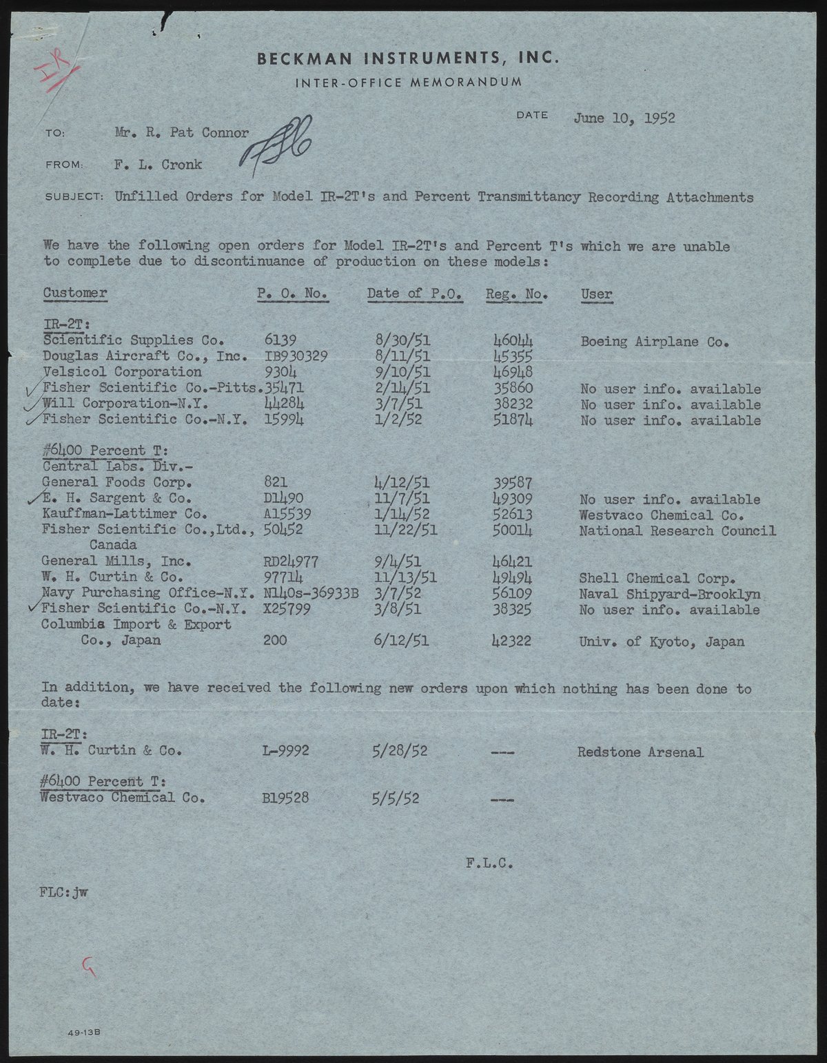 Memo from F. L. Cronk to R. Pat Connor