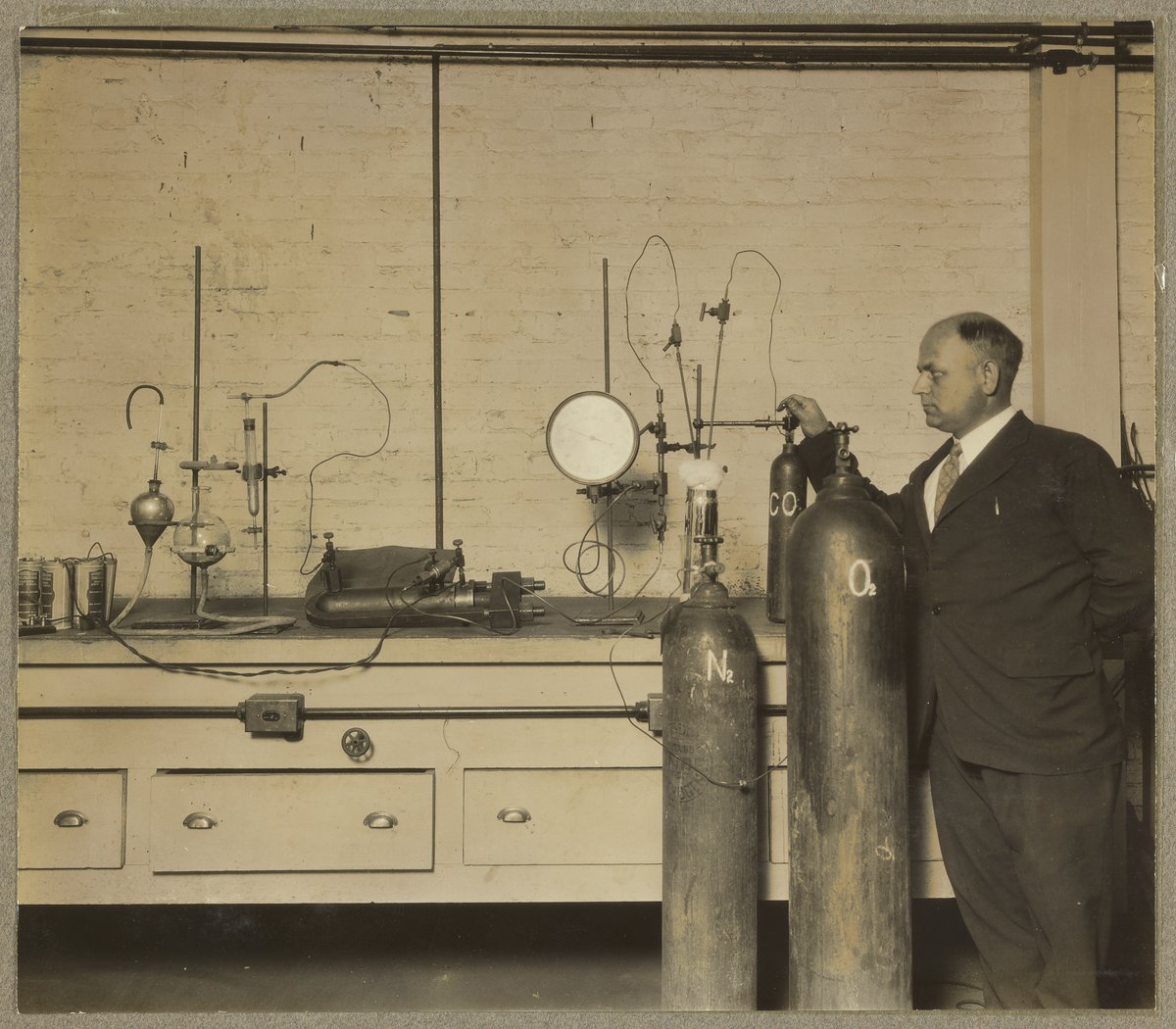 “Dr. C.D. Garby Demonstrating Formation of Nitric Oxide in Flames,” April 1926. Travis P. Hignett Collection of Fixed Nitrogen Research Laboratory Photographs, Box 1. Science History Institute. Philadelphia. https://digital.sciencehistory.org/works/t722h889f.