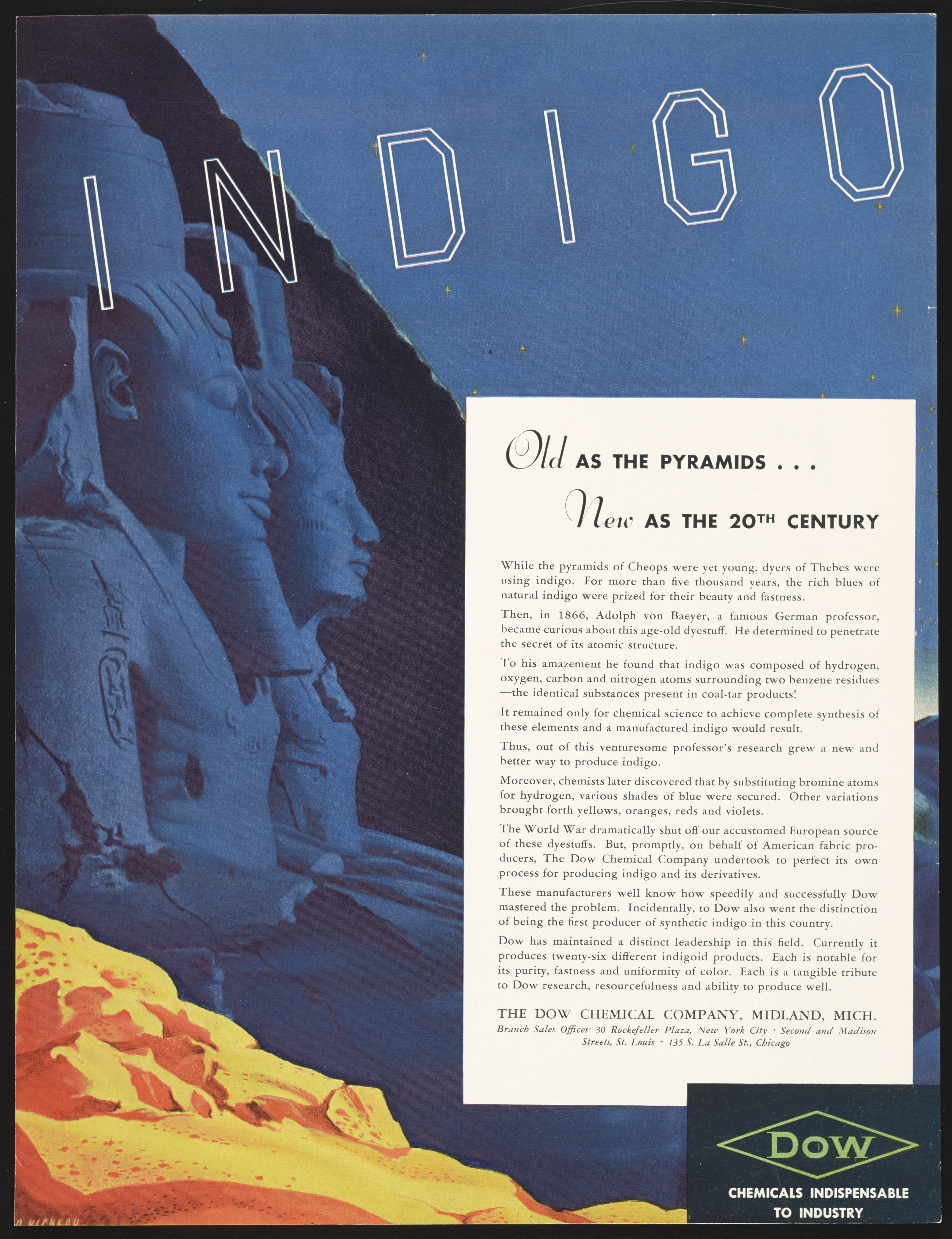 Color print advertisement for synthetic indigo and other indigoid products manufactured and sold by the Dow Chemical Company. The advertisement features images of ancient Egyptian statues with accompanying text detailing the history of indigo and synthetic dyestuffs, emphasizing the purity, fastness, and uniformity of color in Dow products.