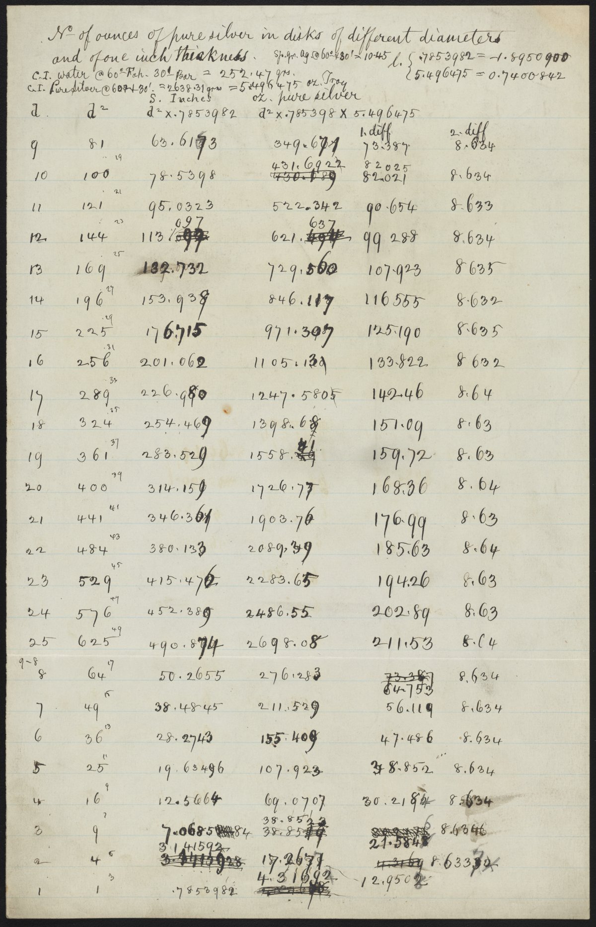 Small JPG1200 x 1866px — 351 KBLarge JPG2880 x 4479px — 1.4 MBFull-sized JPG5268 x 8192px — 3.5 MBOriginal fileTIFF — 5268 x 8192px — 123 MBTabulation of data reporting the number of ounces of pure silver in disks of different diameters and of one inch thickness.