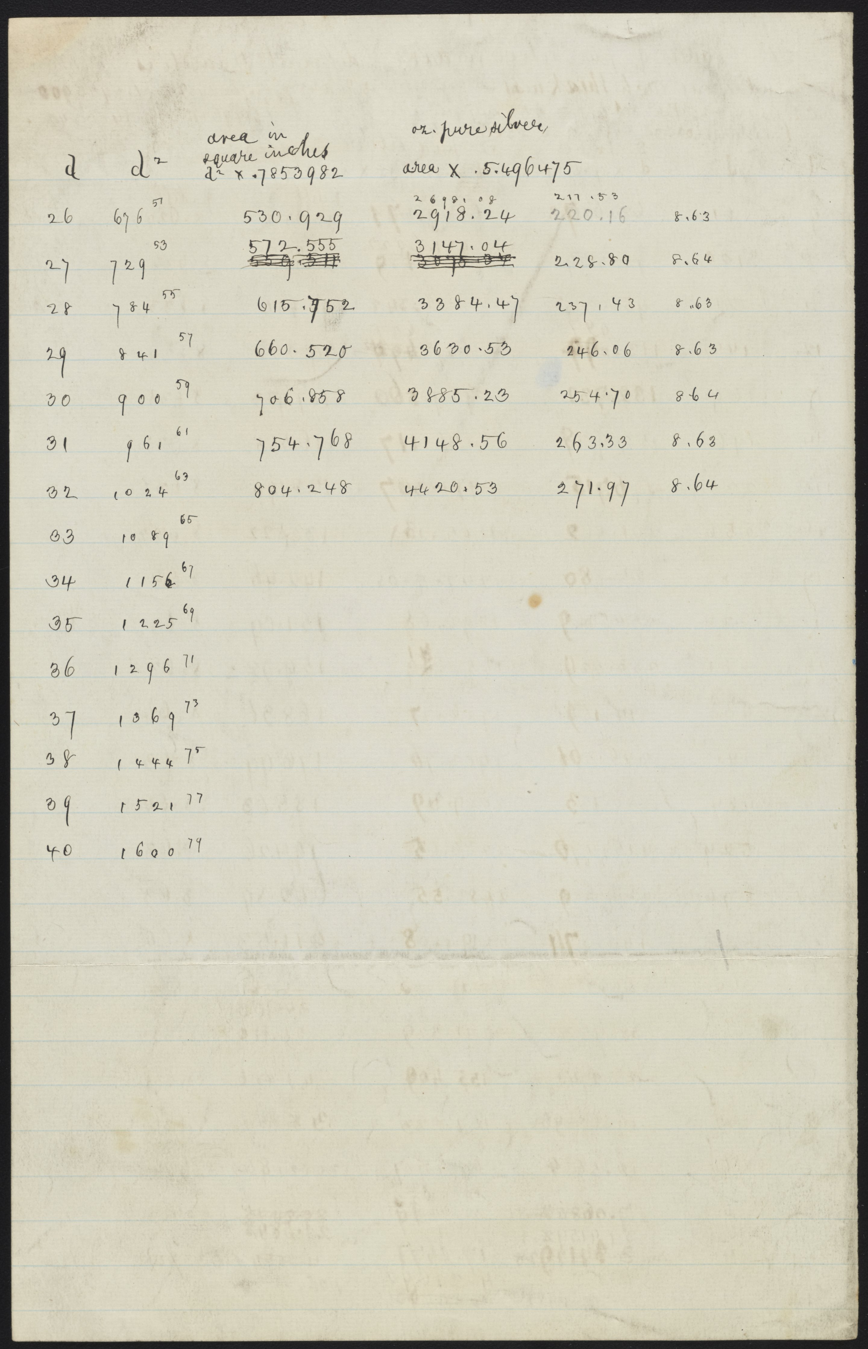 Small JPG1200 x 1866px — 351 KBLarge JPG2880 x 4479px — 1.4 MBFull-sized JPG5268 x 8192px — 3.5 MBOriginal fileTIFF — 5268 x 8192px — 123 MBTabulation of data reporting the number of ounces of pure silver in disks of different diameters and of one inch thickness.