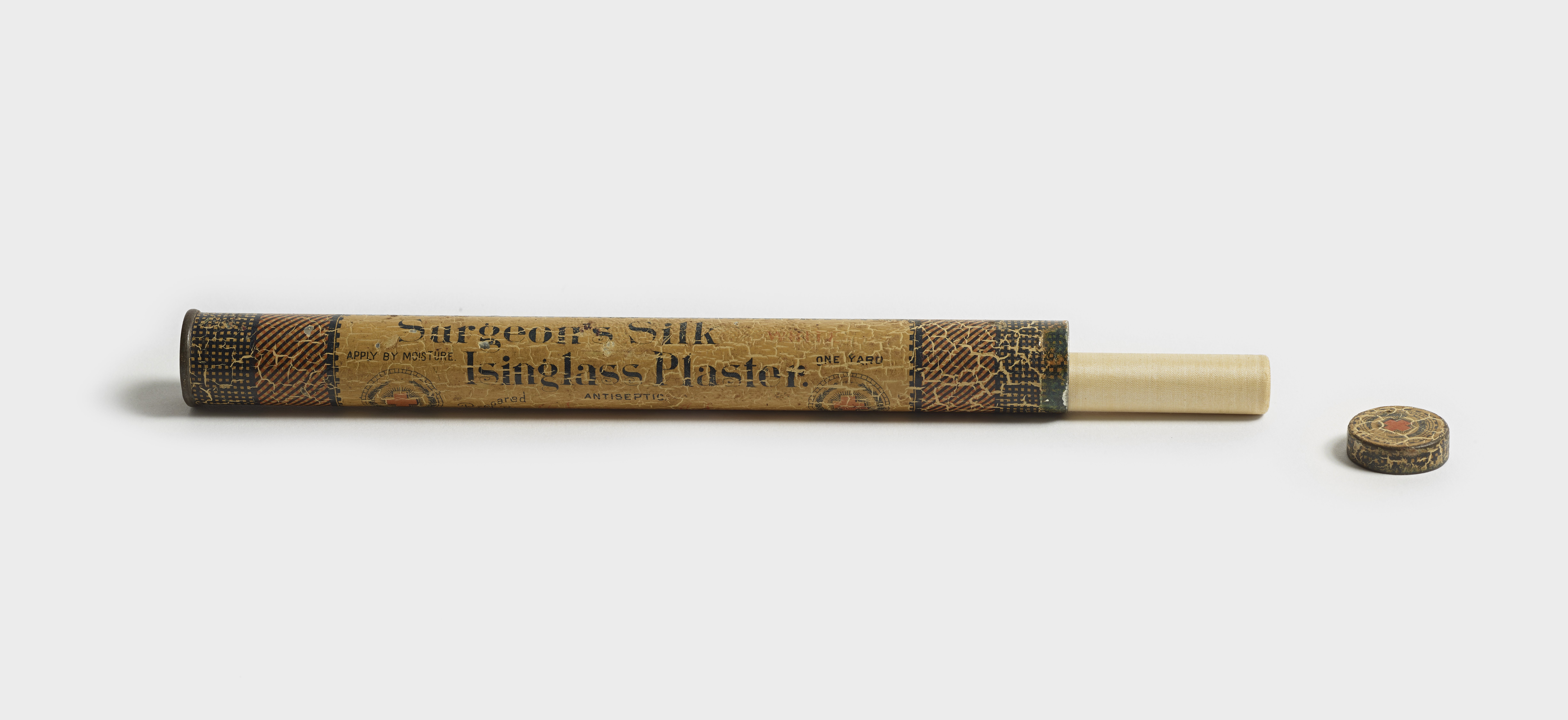Long, thin tin cylinder container with paper label and small cap. Cap opens to reveal roll of cream-colored bandage.