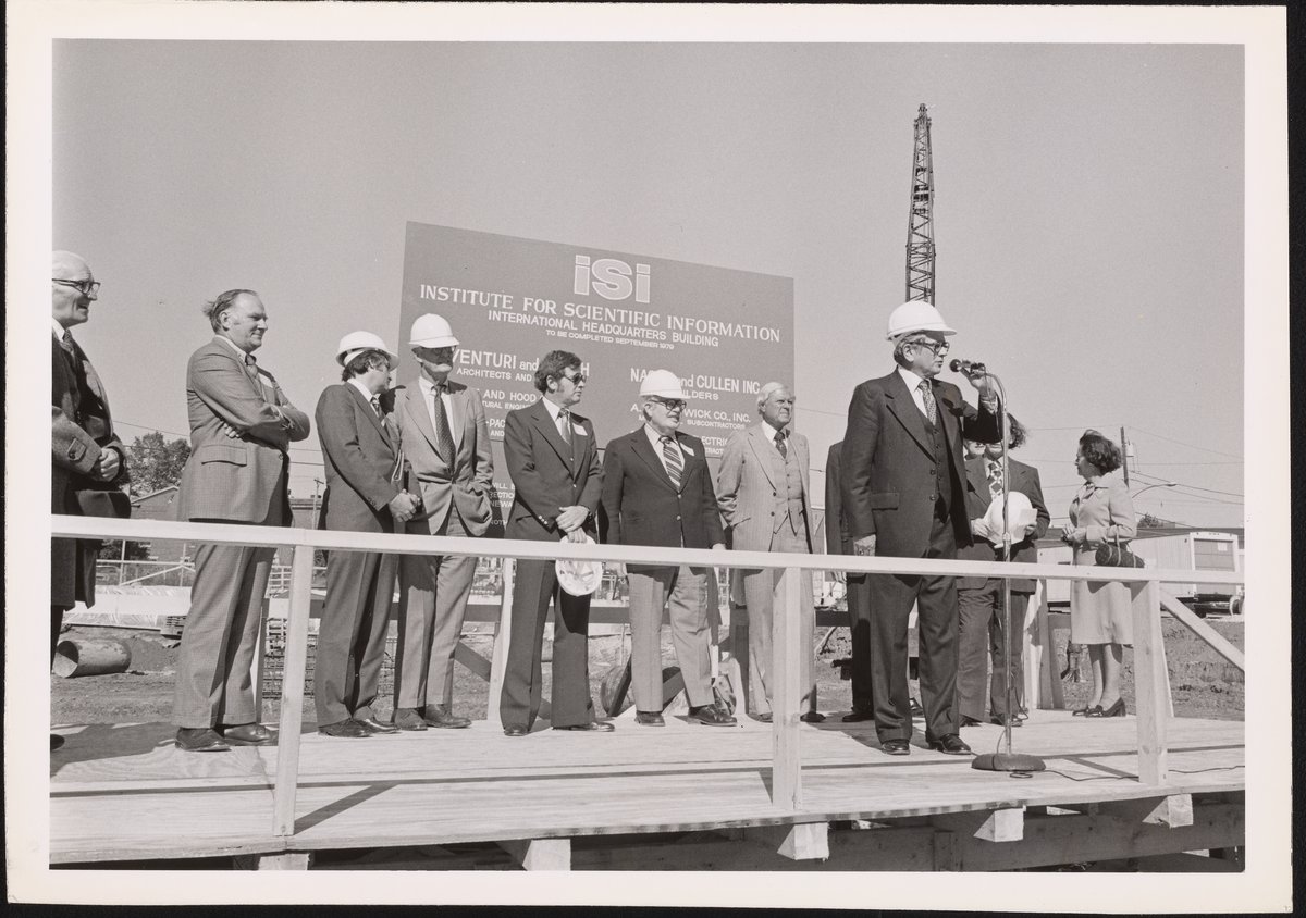 Hofmann, Jo. “Groundbreaking Ceremony for the Institute of Scientific Information International Headquarters,” 1978. Eugene Garfield Papers, Box 123. Science History Institute. Philadelphia. https://digital.sciencehistory.org/works/t7cvsiu.