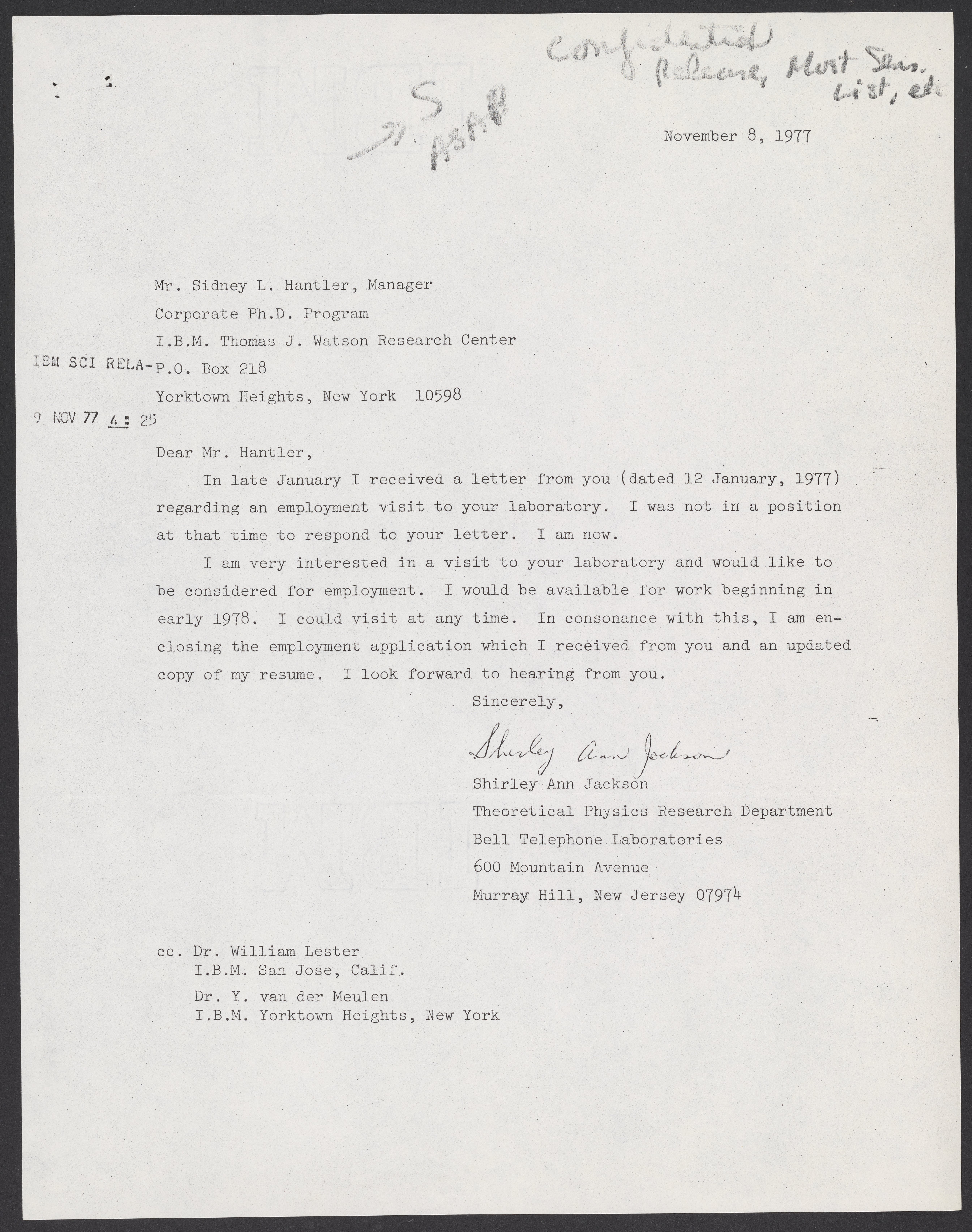 Shirley Ann Jackson (1946-) writes to Sidney L. Hantler, informing him that she would like to be considered for employment at the IBM Thomas J. Watson Research Center.