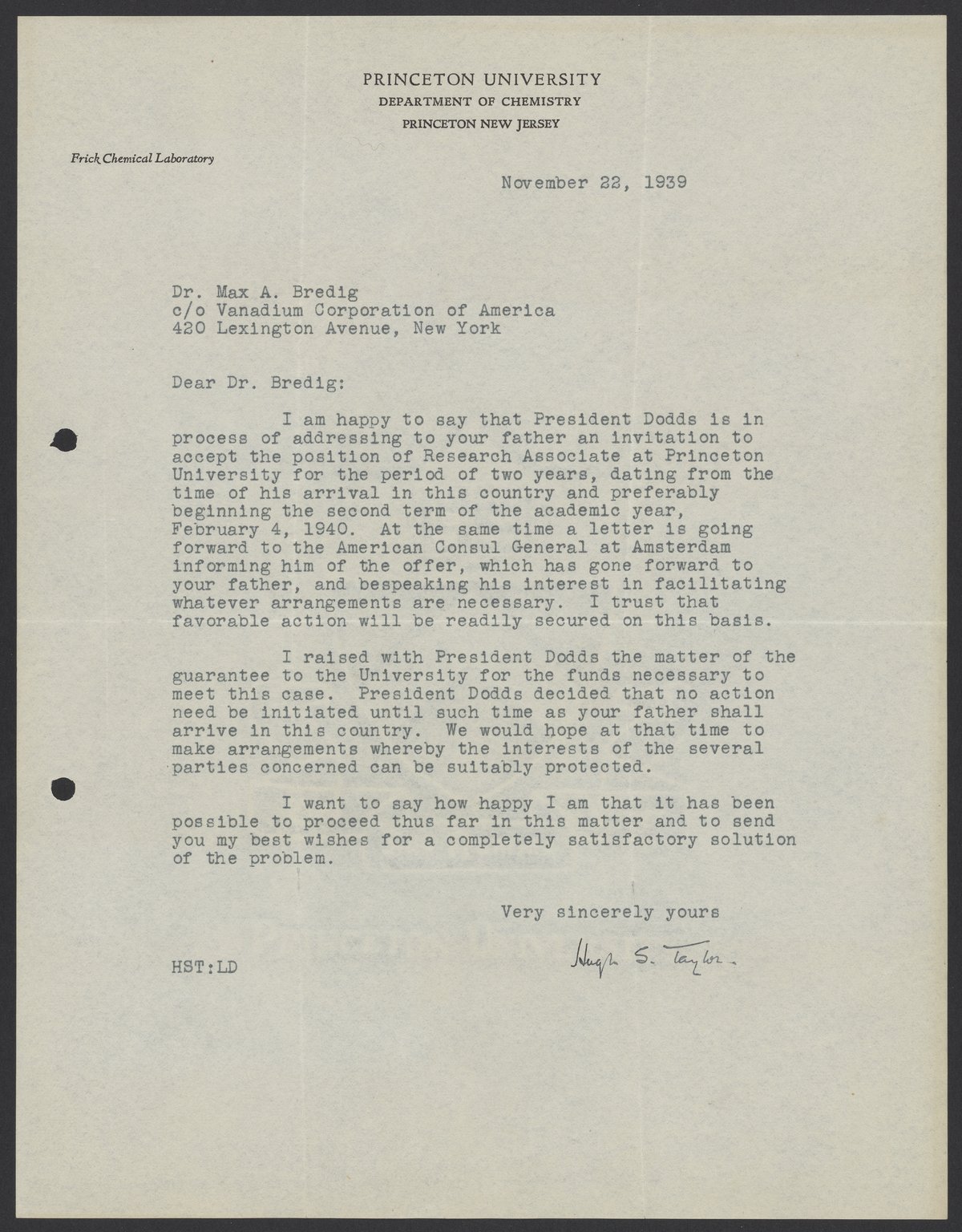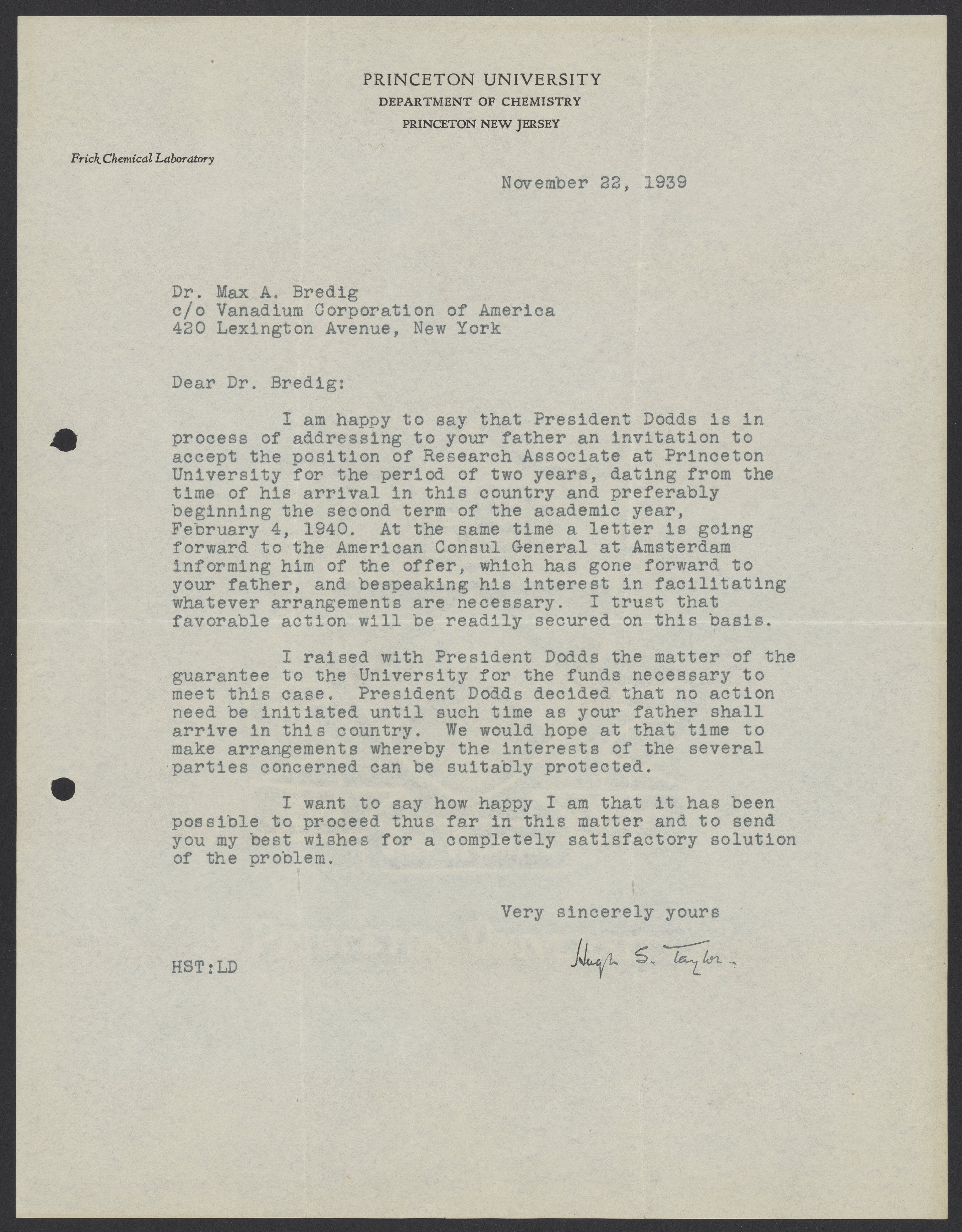 Hugh S. Taylor (1890-1974) informs Max Bredig (1902-1977) that the Princeton University President, Harold Willis Dodds (1889-1980) is in the process of writing an offer letter for a two-year Research Associate position for Max's father, Georg Bredig (1868-1944).