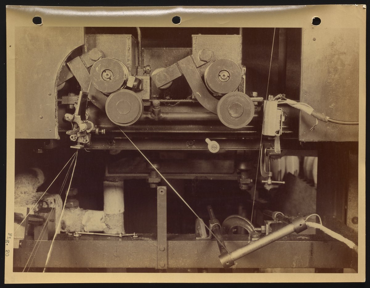 Small JPG1200 x 1522px — 285 KBLarge JPG2880 x 3653px — 1.3 MBFull-sized JPG3668 x 4652px — 2.0 MBOriginal fileTIFF — 3668 x 4652px — 48.8 MBTwo views of a two-position tire cord machine used during the early stages of synthetic fiber production and research at DuPont. The hot pin and hot plate tandem apparatus used to draw various fibers is visible in both photographs. The photographs are captioned "Figure 19" and "Figure 20," indicating that they appeared in a report or publication.