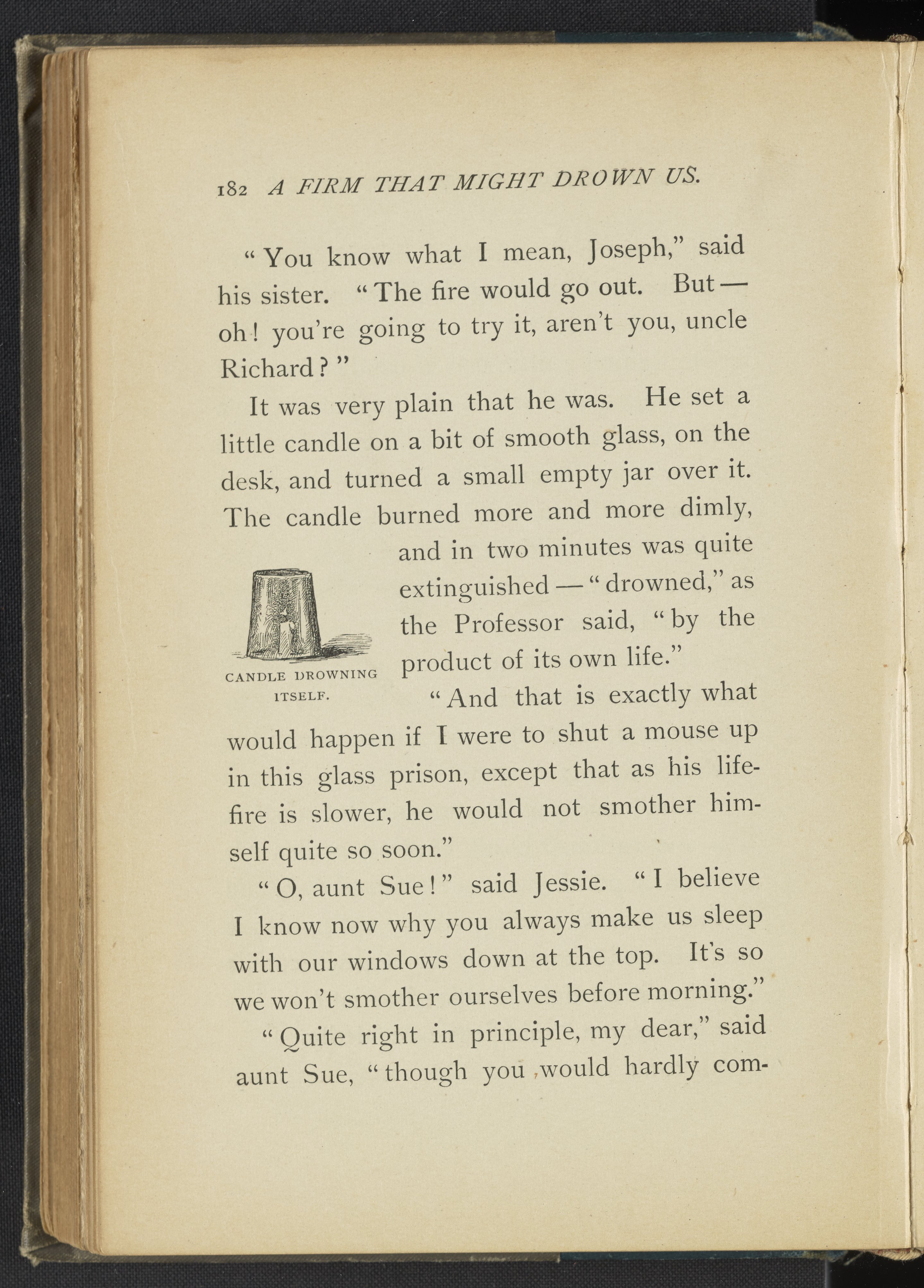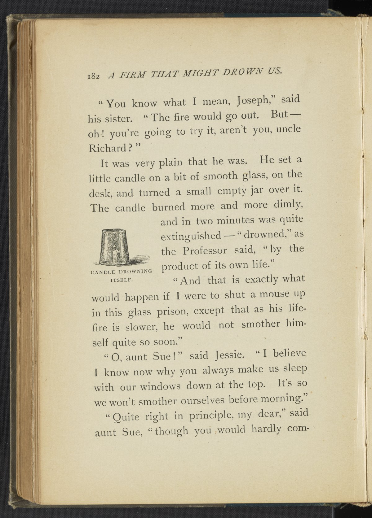 Meyer, Lucy Rider. “Candle Drowning Itself.” Real Fairy Folks, or, Fairy Land of Chemistry: Explorations in the World of Atoms. Boston, Massachusetts: Lothrop Publishing Company, 1887. https://digital.sciencehistory.org/works/tb09j613t.