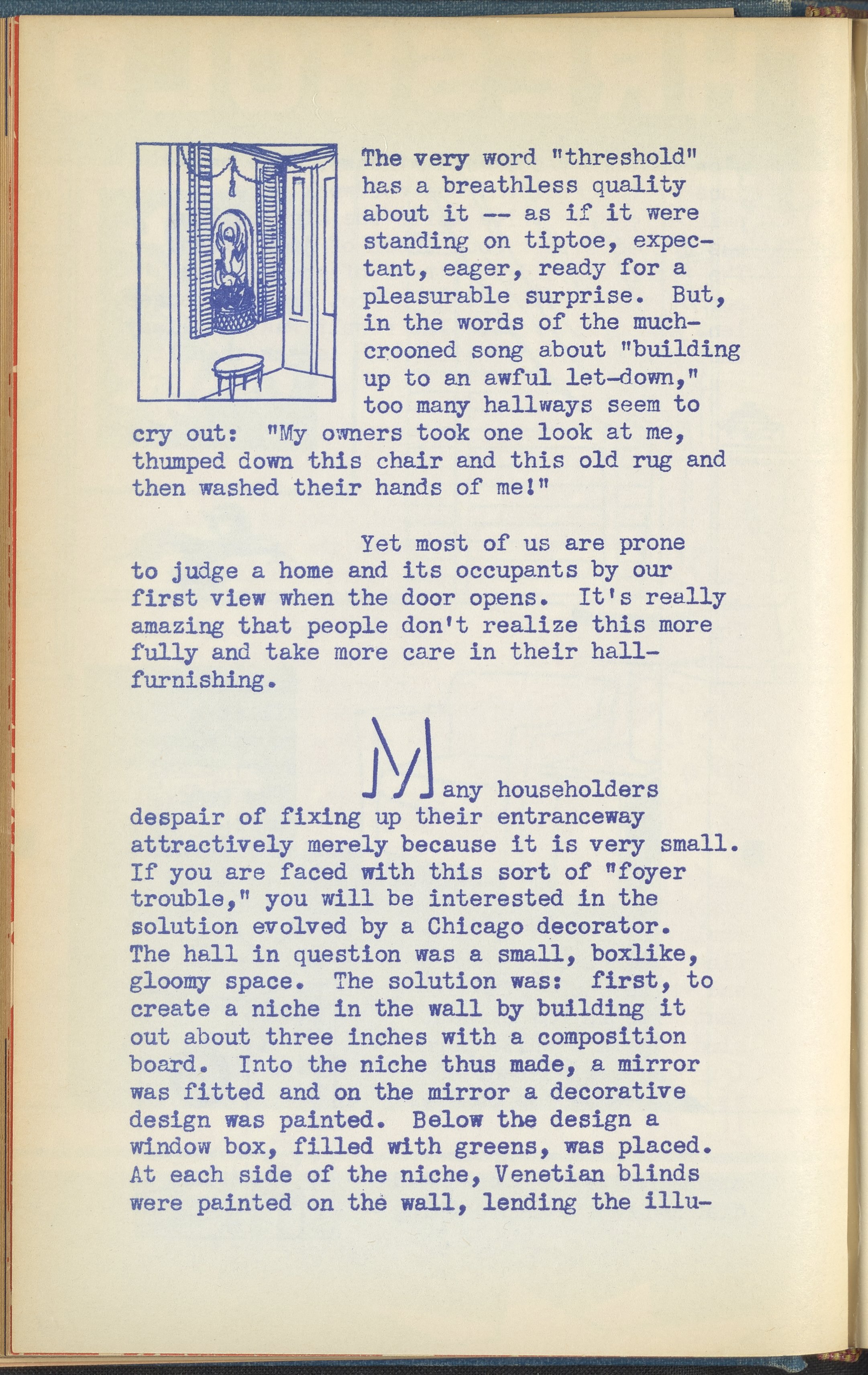 Booklet corresponding to a radio broadcast program created by the National Paint, Varnish, and Lacquer Association. The booklet discusses the importance of having an attractive home entranceway and provides tips for painting and decorating foyers, halls, and thresholds of various shapes and sizes. Includes small stylized illustrations throughout and decorated covers.