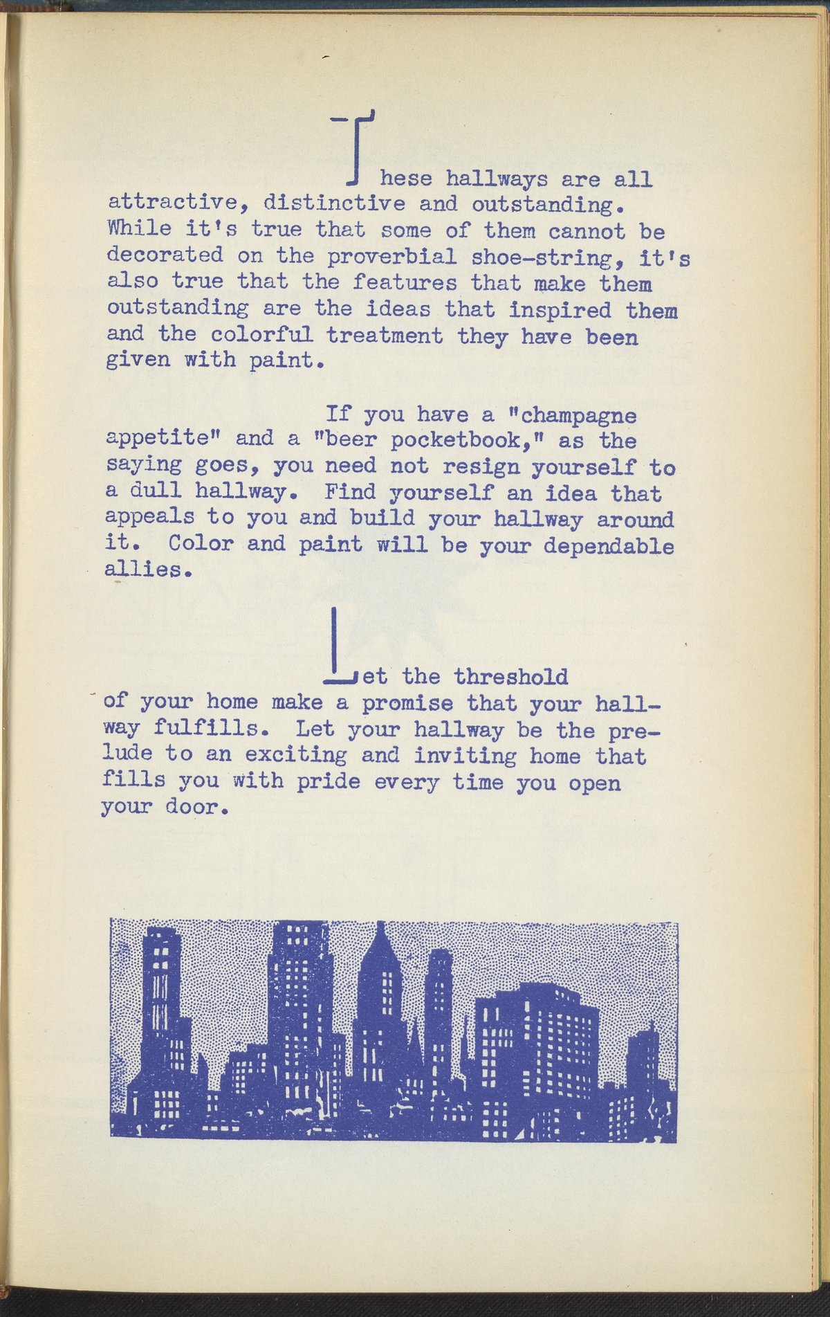 Booklet corresponding to a radio broadcast program created by the National Paint, Varnish, and Lacquer Association. The booklet discusses the importance of having an attractive home entranceway and provides tips for painting and decorating foyers, halls, and thresholds of various shapes and sizes. Includes small stylized illustrations throughout and decorated covers.