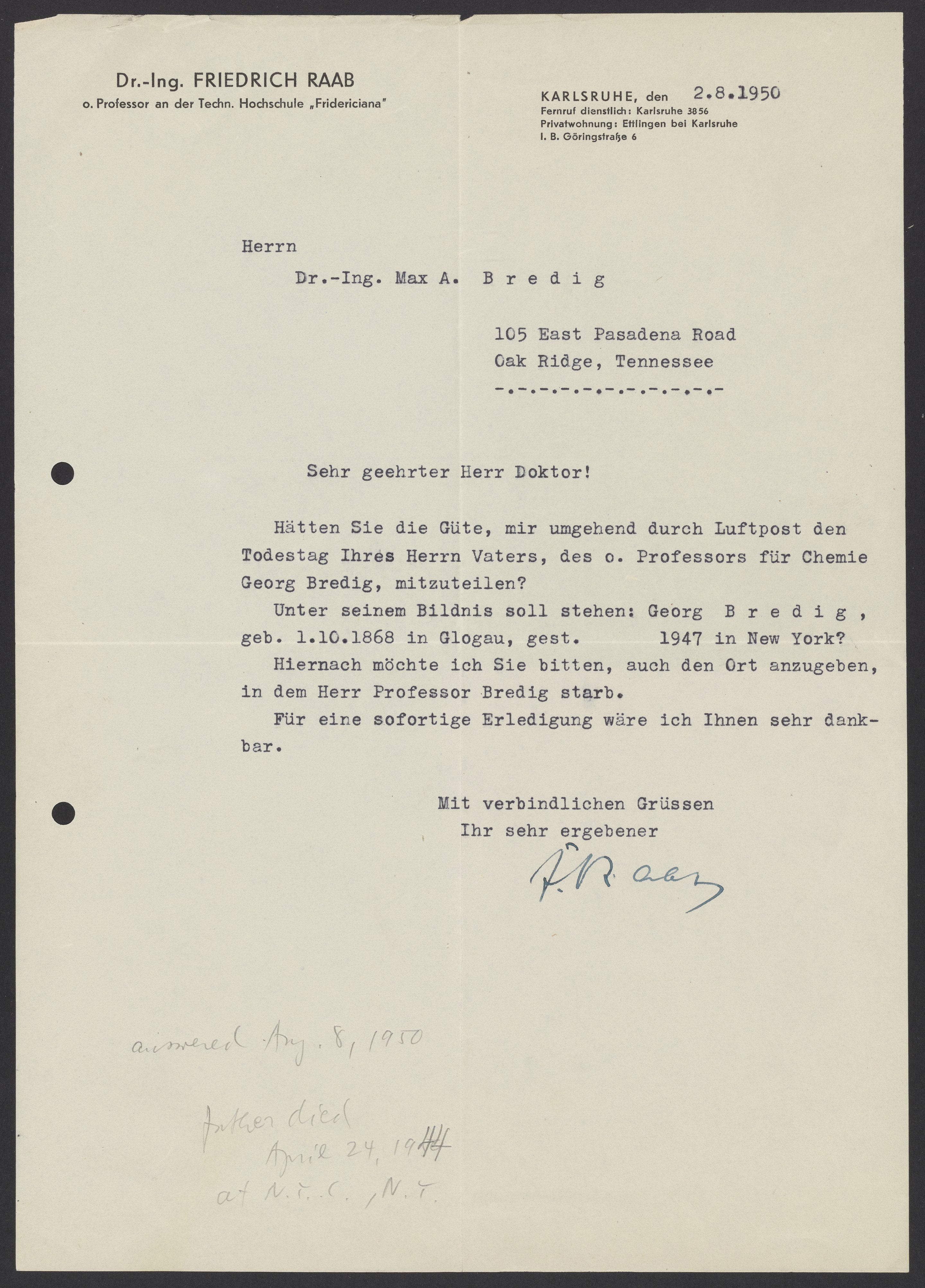 Letter from Friedrich Raab to Max Bredig, August 1950