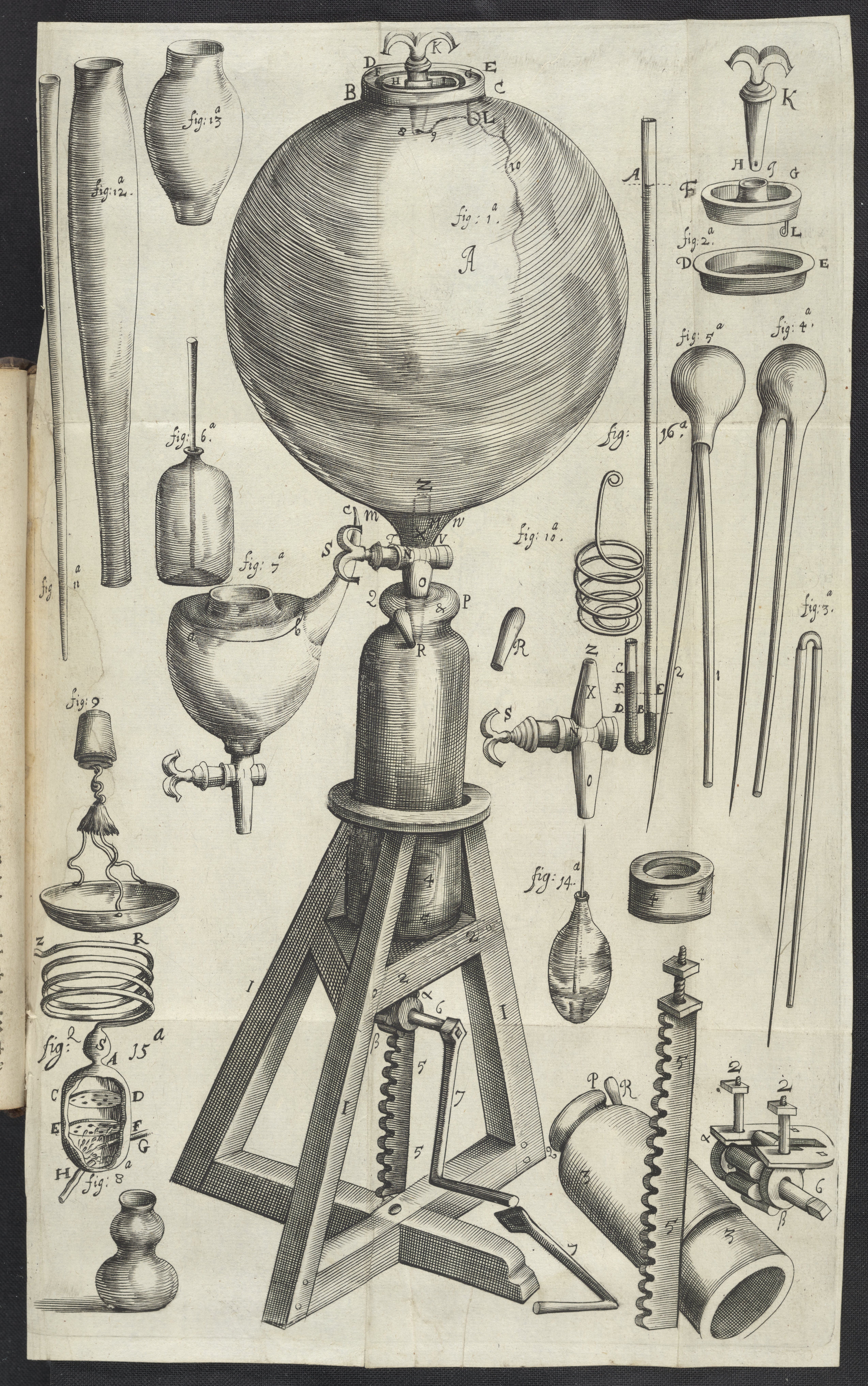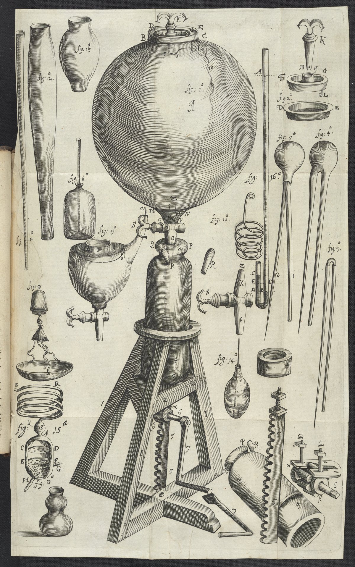 Folding copperplate engraving illustrating sixteen figures including the pneumatical engine and components used in pneumatic experiments leading to the discovery of Boyle's law.