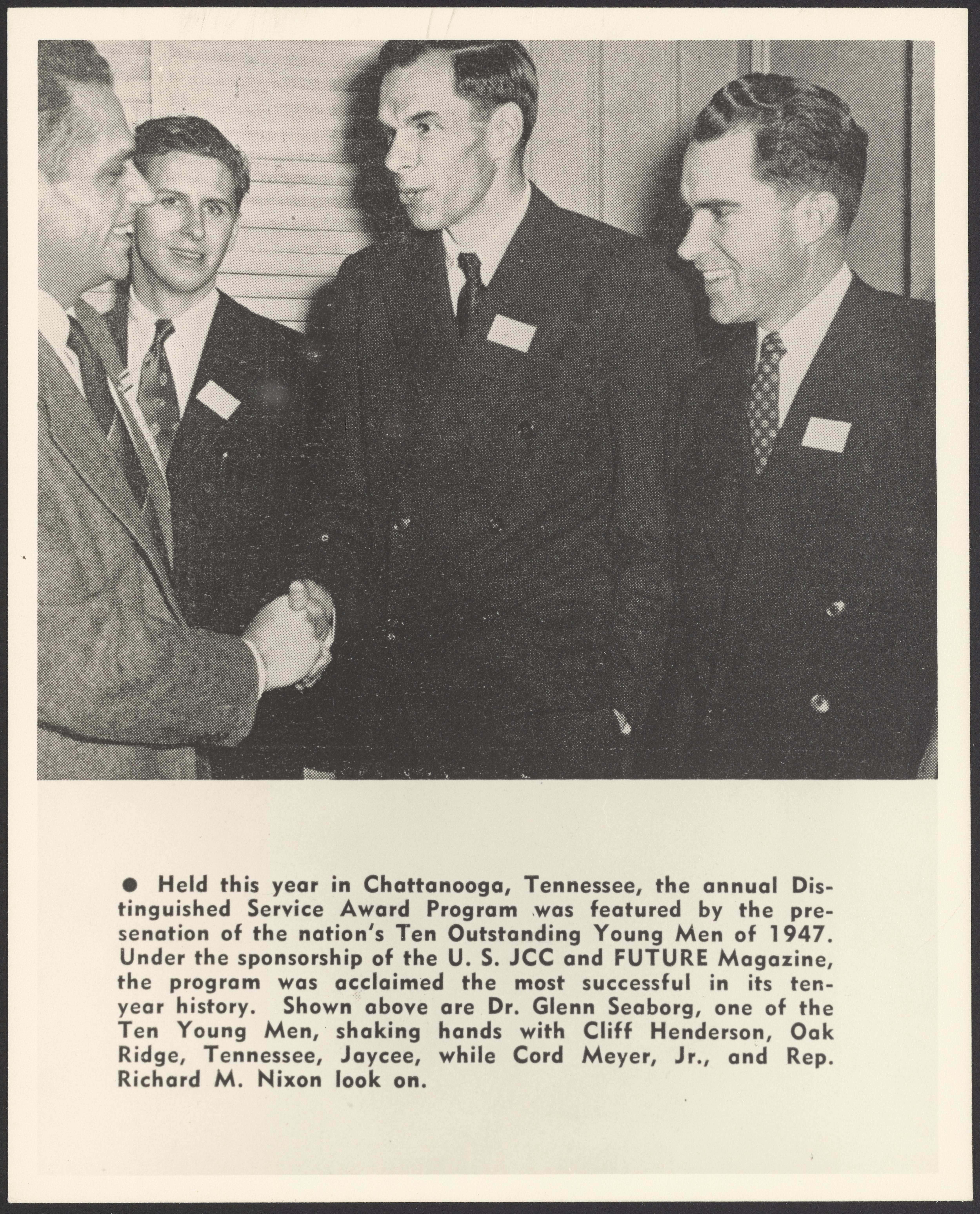 Black and white photograph showing Glenn Seaborg (1912-1999) shaking hands with Cliff Henderson (1895–1984) during the Ten Outstanding Young Men of 1947 awards event. Cord Meyer Jr. (1920-2001) and Richard M. Nixon (1913-1994) look on.
