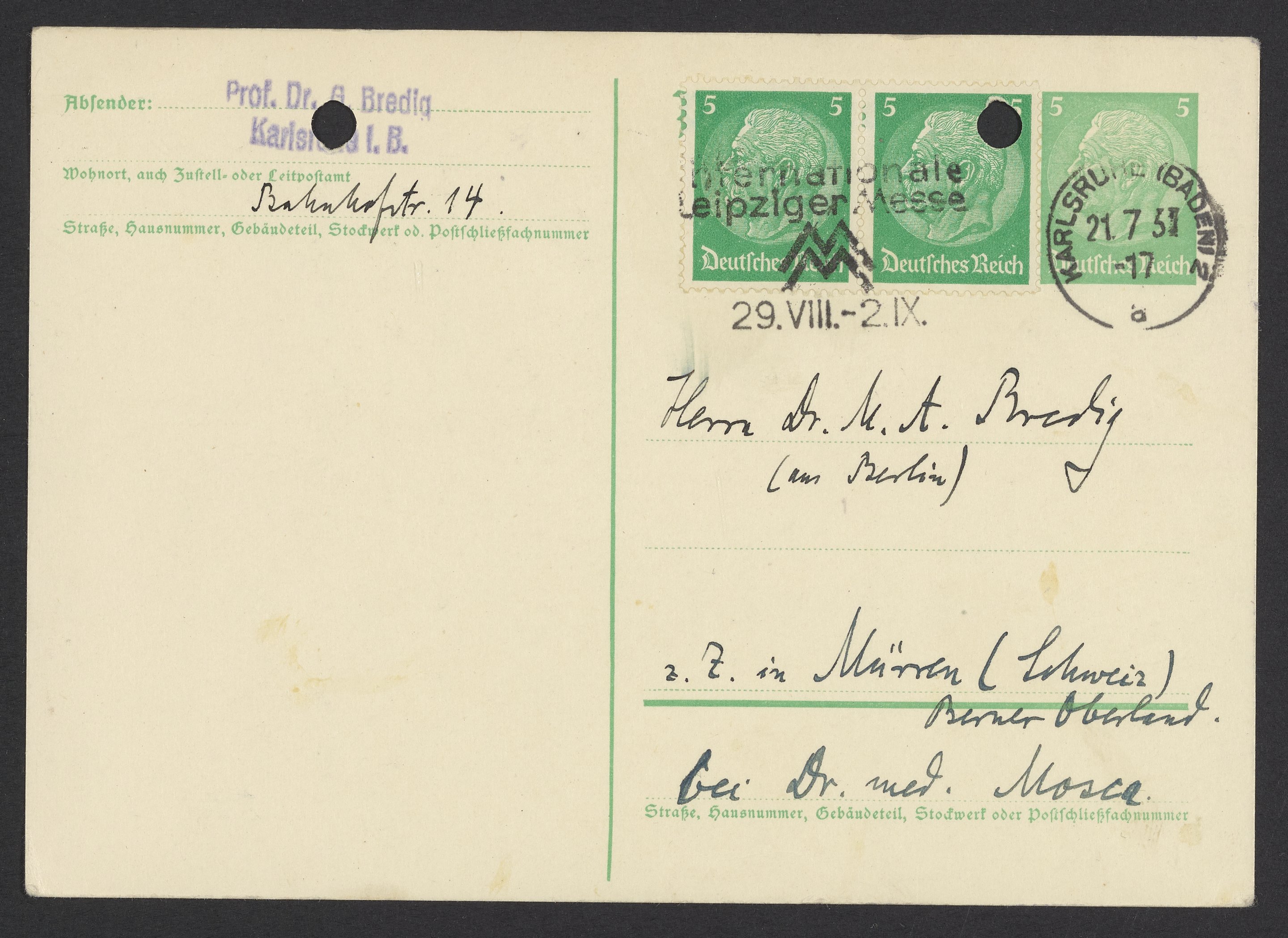 Postcard from Georg Bredig to Max Bredig, July 21, 1937