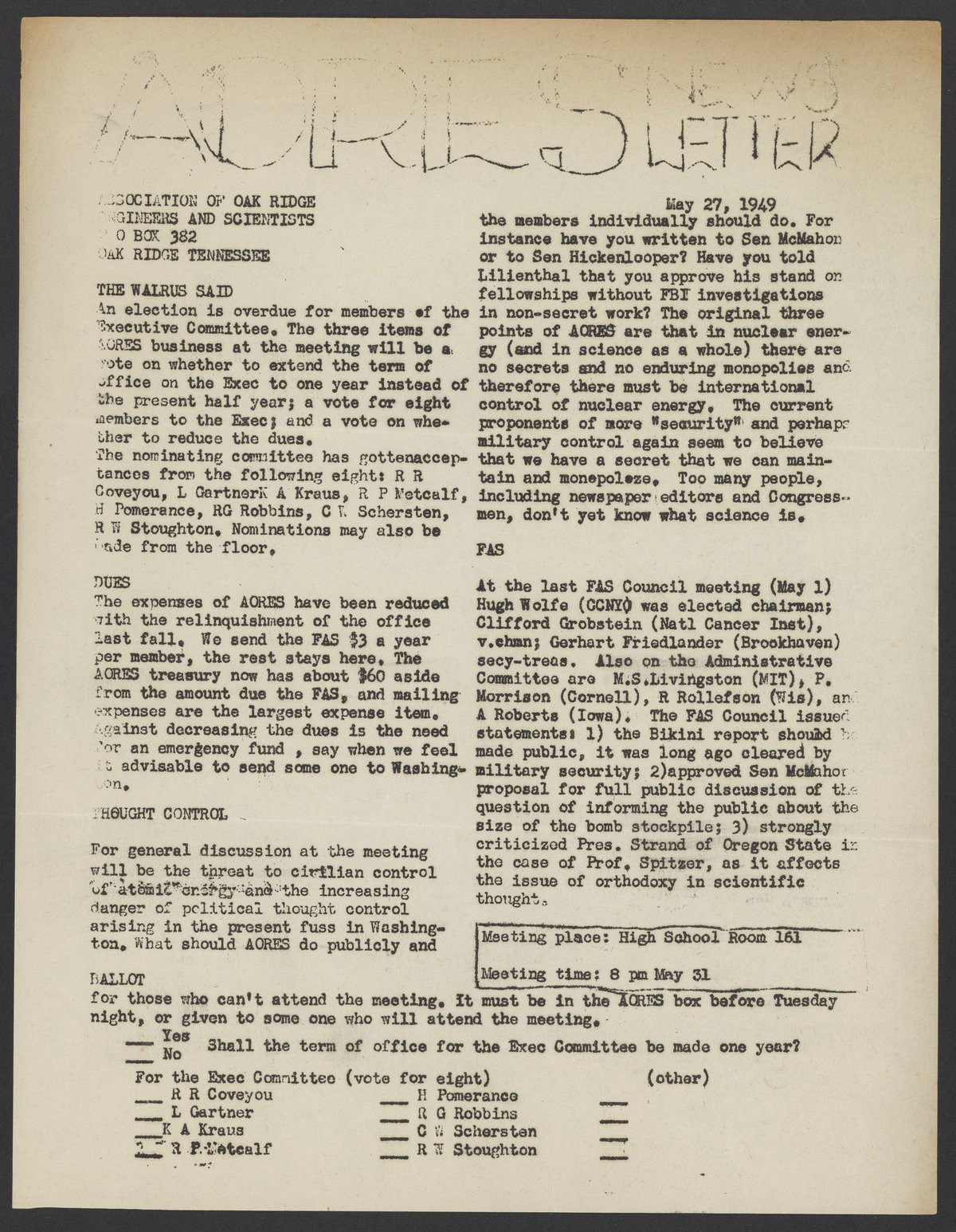 Newsletter for the Association of Oak Ridge Engineers and Scientists (AORES), May 27, 1949