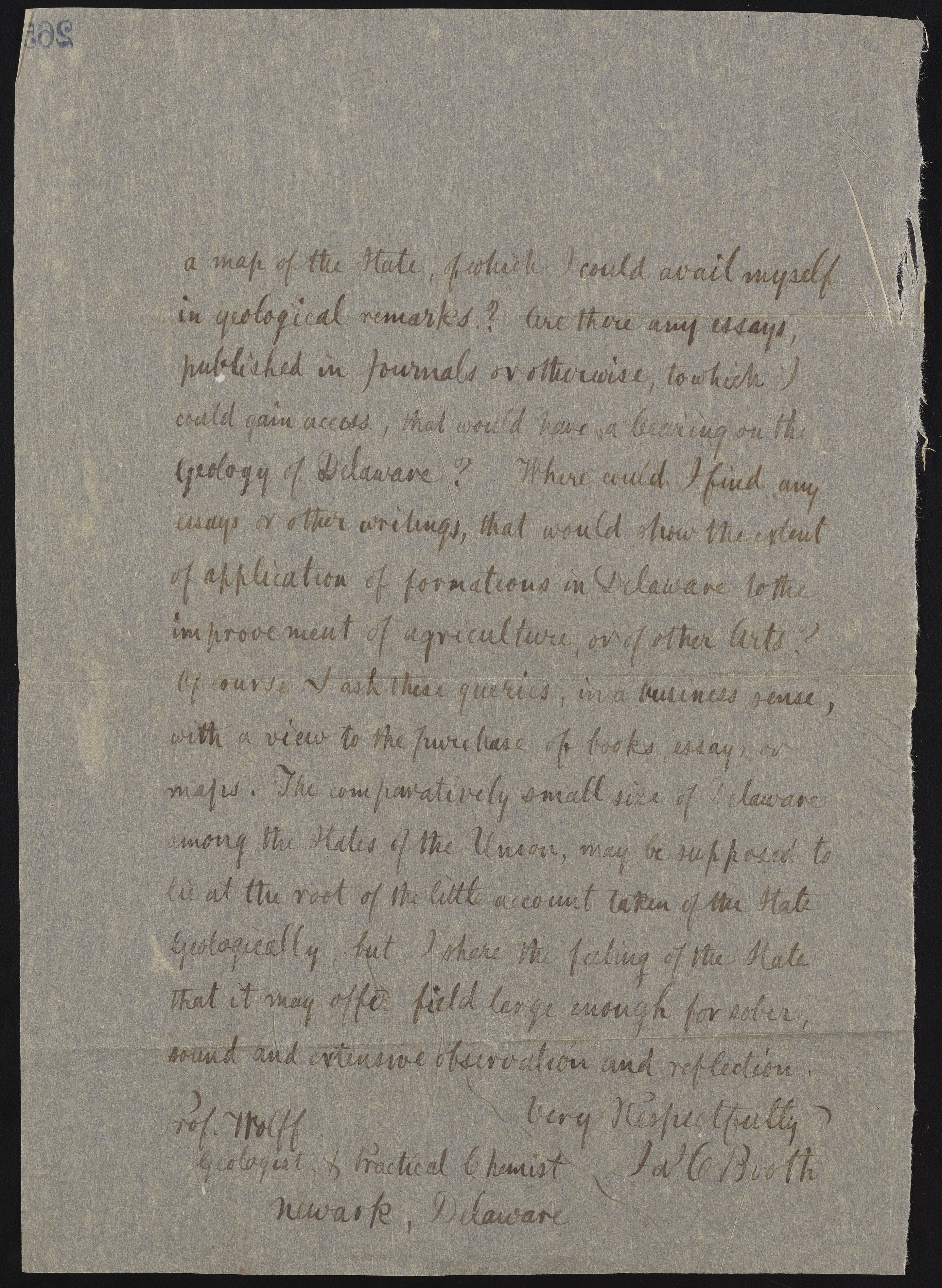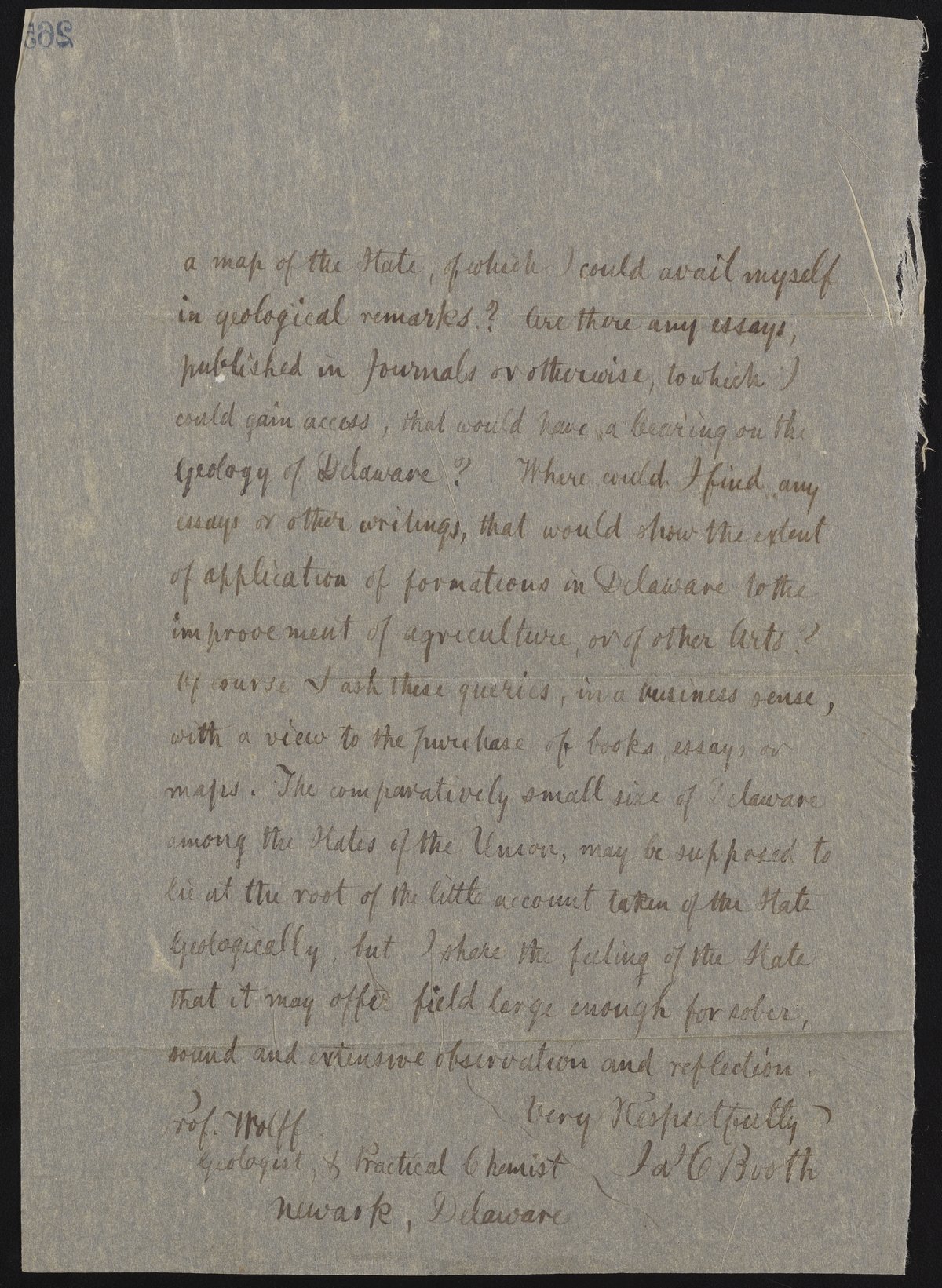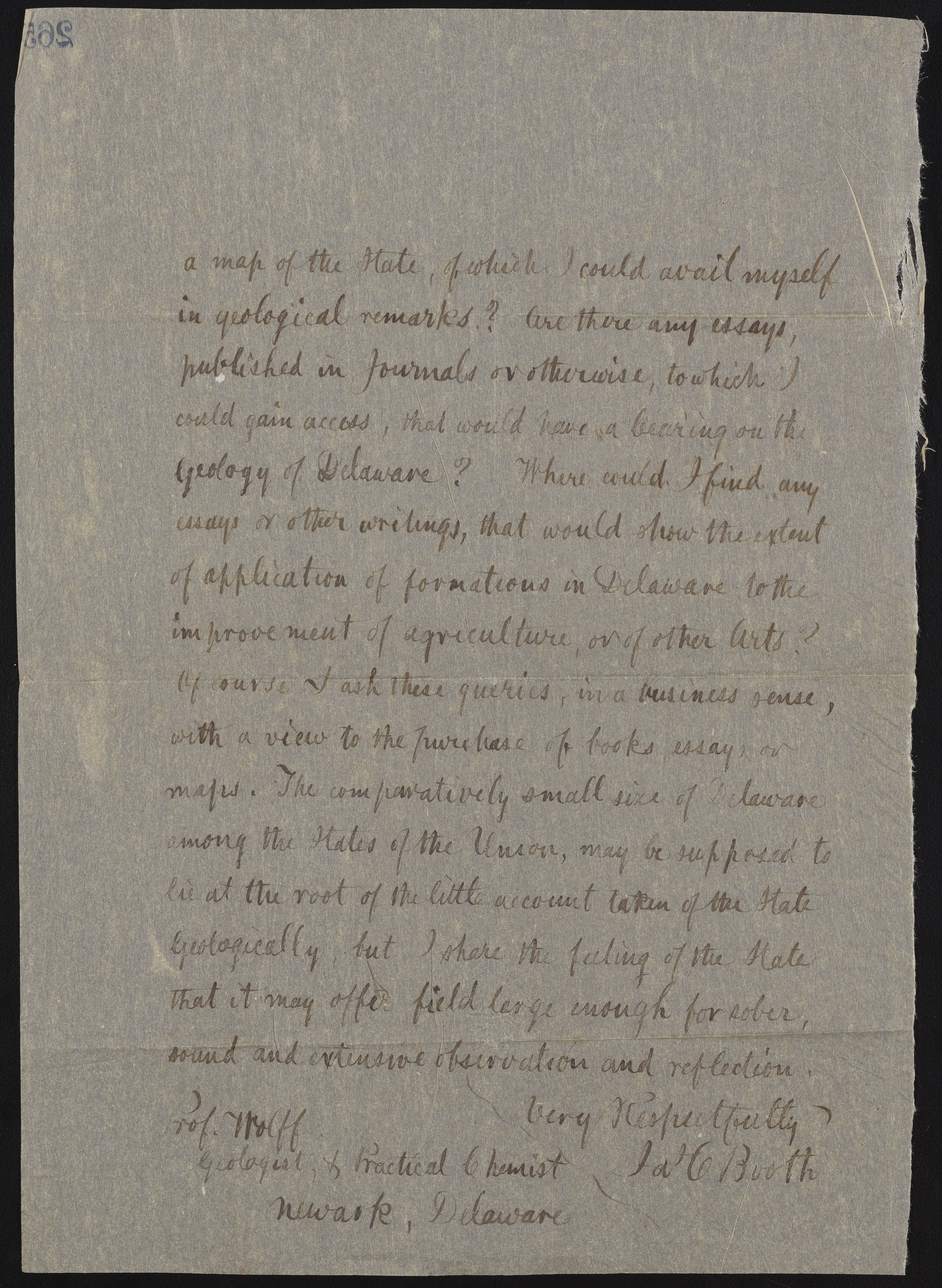 James Curtis Booth (1810-1888) writes to a Professor Wolff in Newark, Delaware to enquire about a geological survey of Delaware.