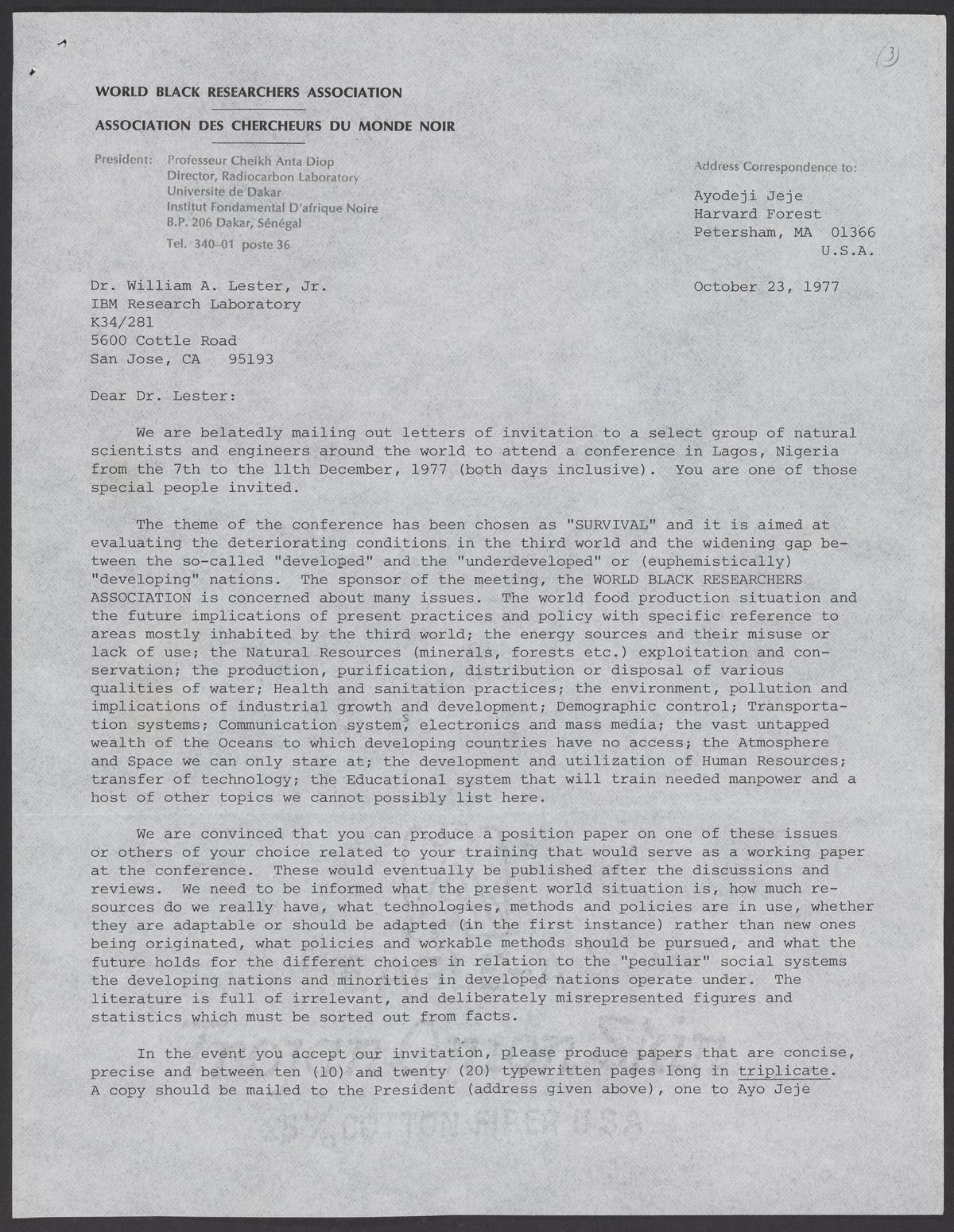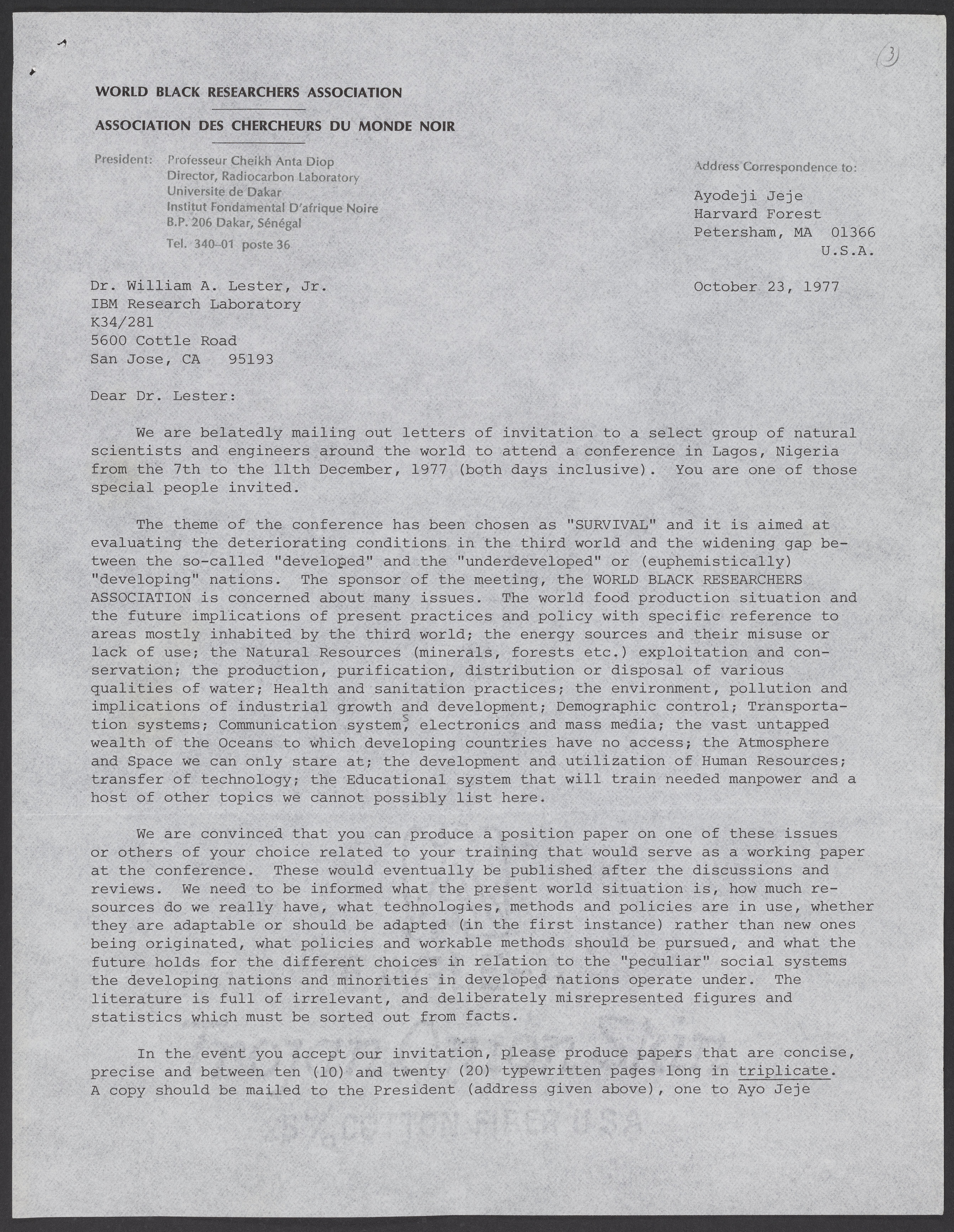 Letter from Ayodeji Jeje to William A. Lester, Jr. (1937-) inviting him to a conference in Lagos, Nigeria sponsored by the World Black Researchers Association (WBRA). Themed "Survival," the conference was about the widening gap between "developed" and "undeveloped" nations.