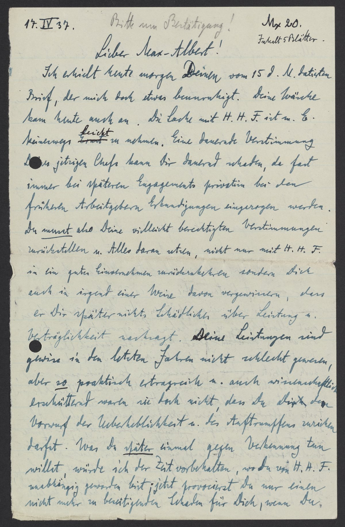 Letter from Georg Bredig to Max Bredig, April 17, 1937