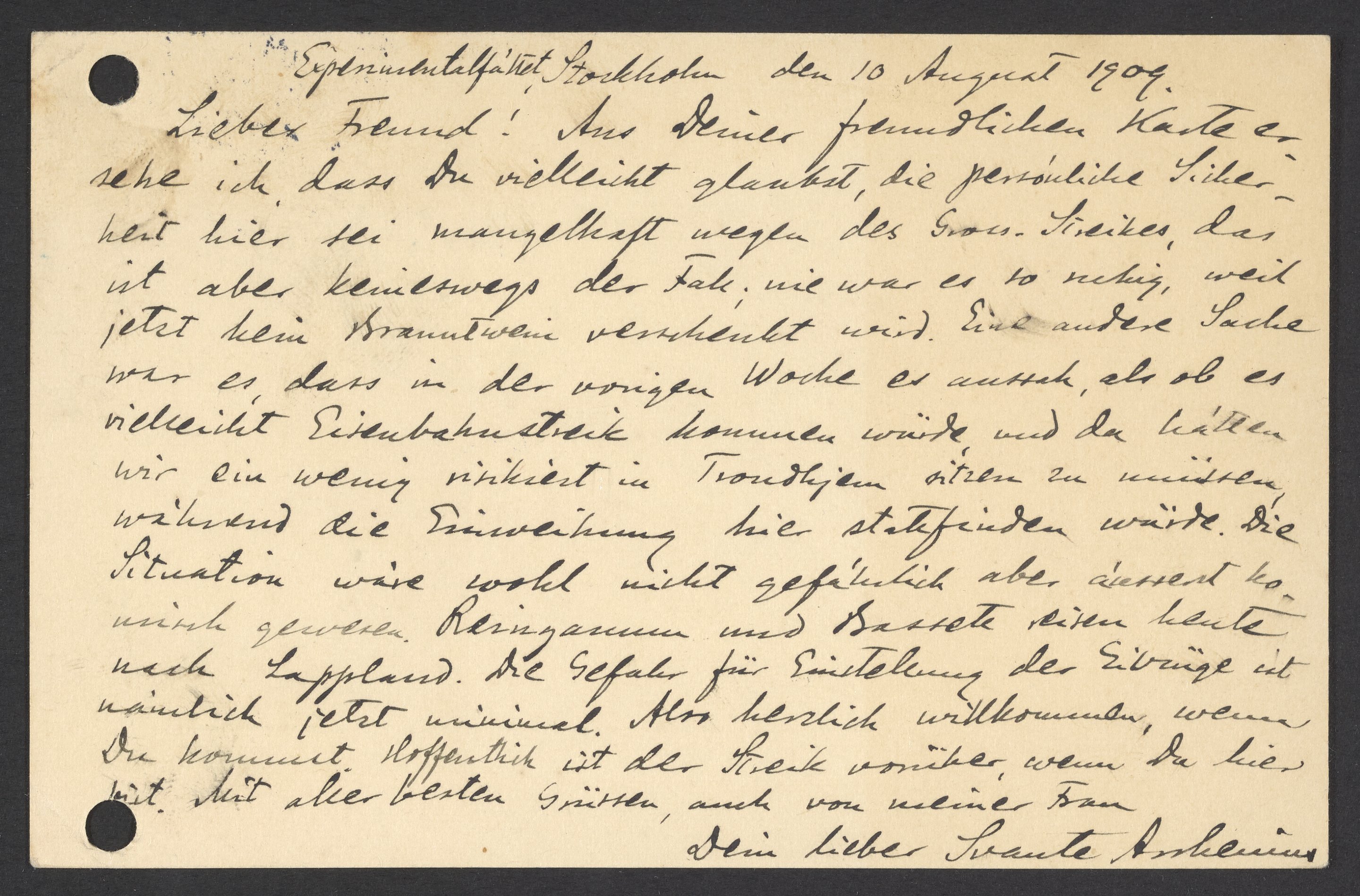 Small JPG1200 x 791px — 177 KBLarge JPG2880 x 1898px — 887 KBFull-sized JPG3531 x 2327px — 1.2 MBOriginal fileTIFF — 3531 x 2327px — 23.6 MBPostcard from Svante Arrhenius (1859-1927) to Georg Bredig (1864-1944) discussing the Swedish general strike in Stockholm, Sweden. The Swedish general strike took place from August 1909 through September 1909. Arrhenius tells Bredig not to worry about his safety for his upcoming visit to Stockholm and makes light of the strike.