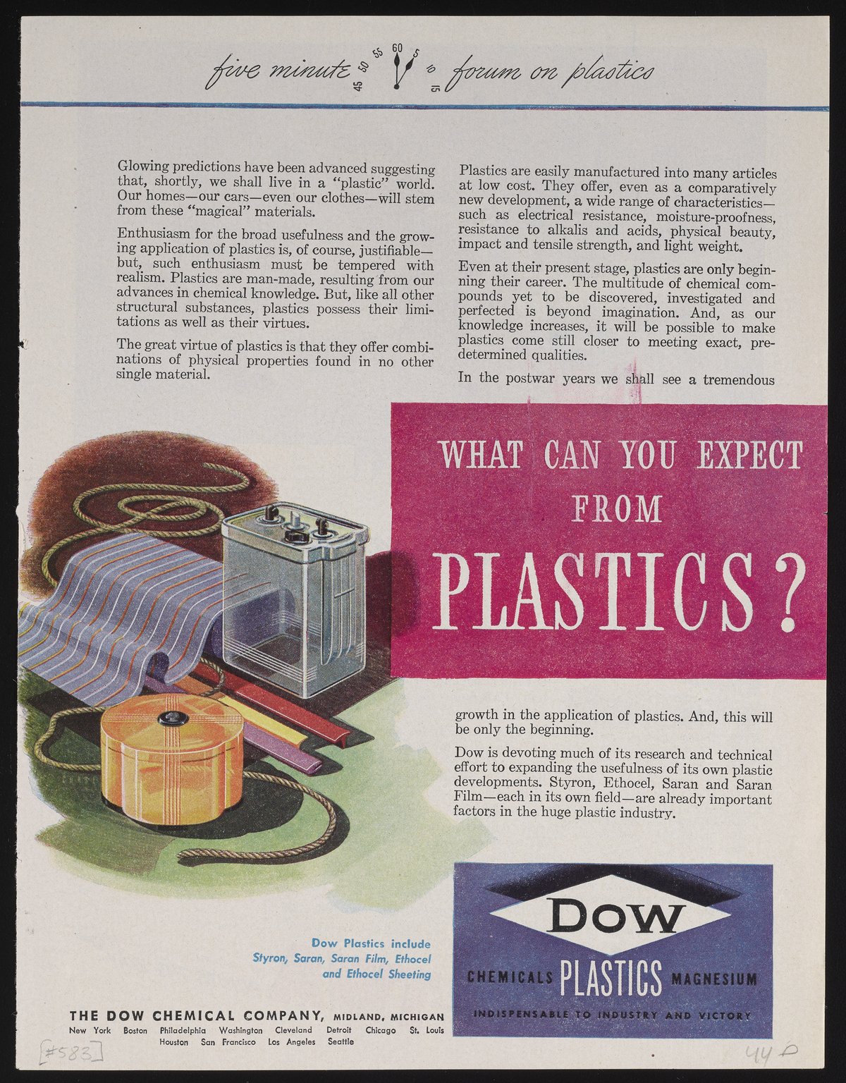 Dow Chemical Company. “What Can You Expect from Plastics?,” 1944. Advertisements from the Dow Chemical Historical Collection, Box 9. Science History Institute. Philadelphia. https://digital.sciencehistory.org/works/tjz202g.