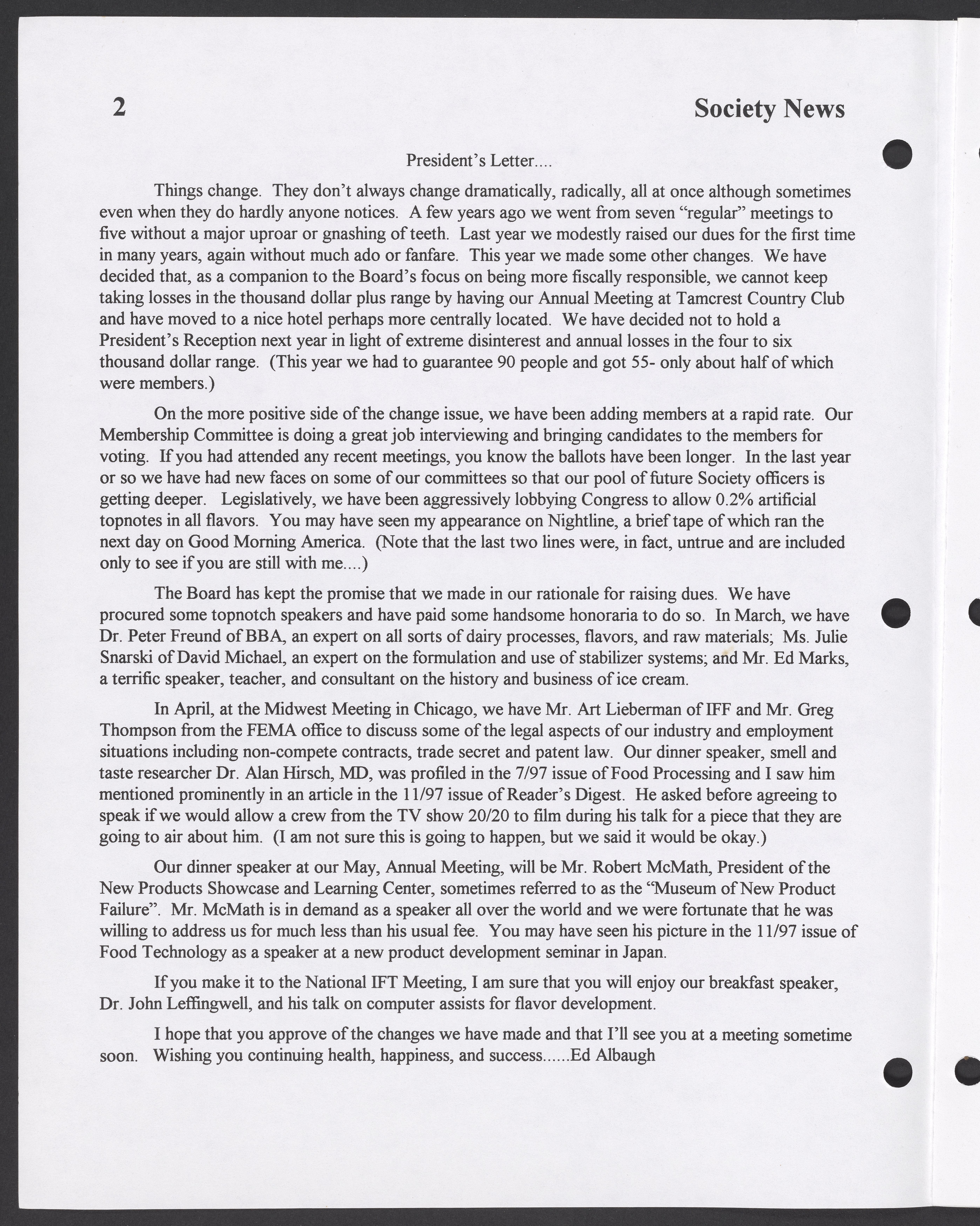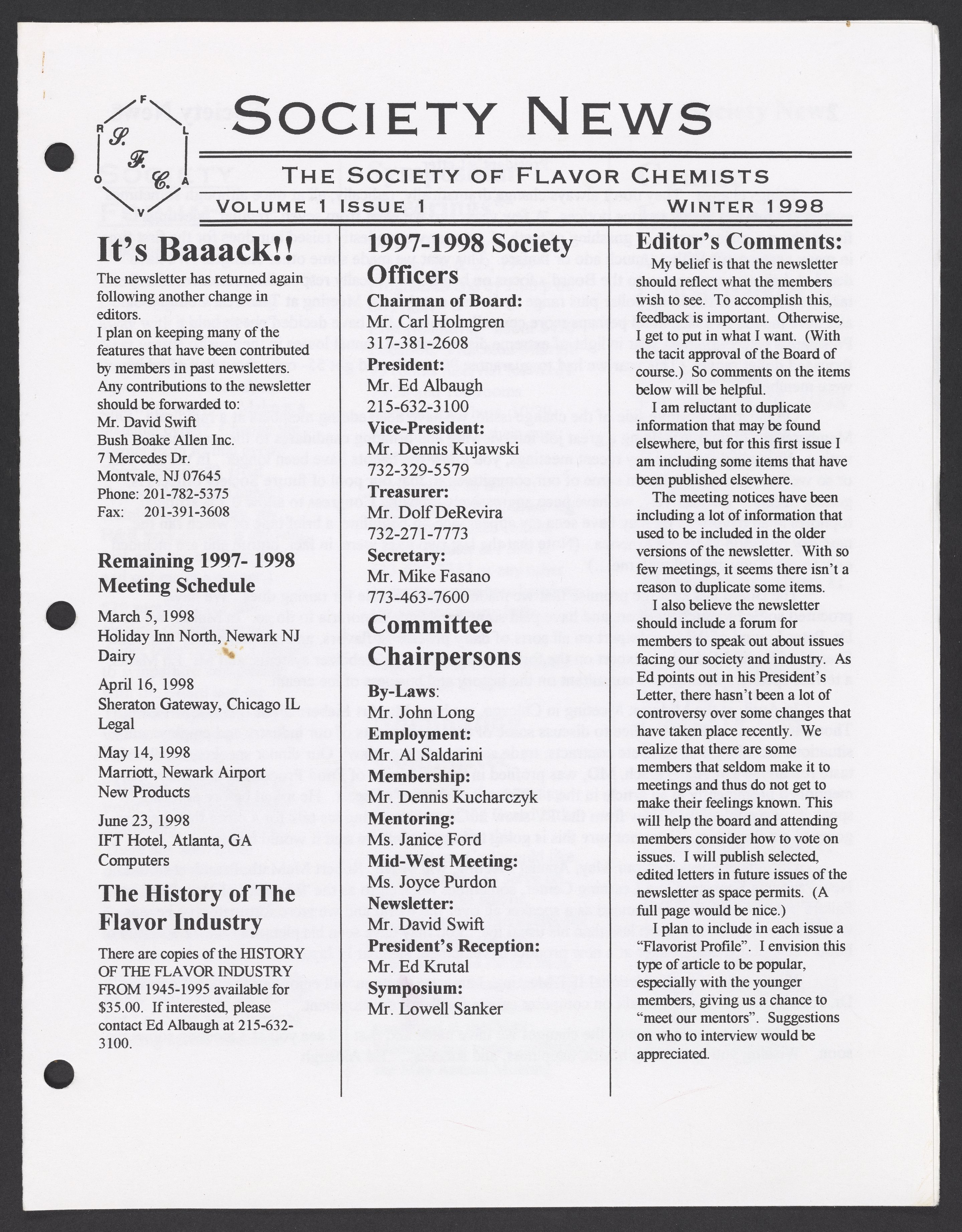 Society of Flavor Chemists. “Society News, Volume 1, Issue 1,” 1998. Society of Flavor Chemists, Society News, Box 1, Folder 2. Science History Institute. Philadelphia. https://digital.sciencehistory.org/works/tl70k9h.