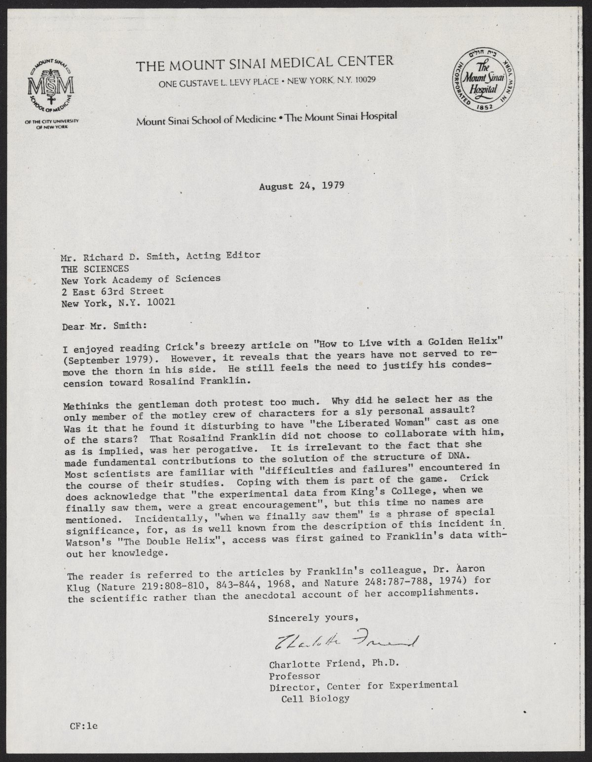 Letter from Charlotte Friend to Richard D. Smith, August 24, 1979