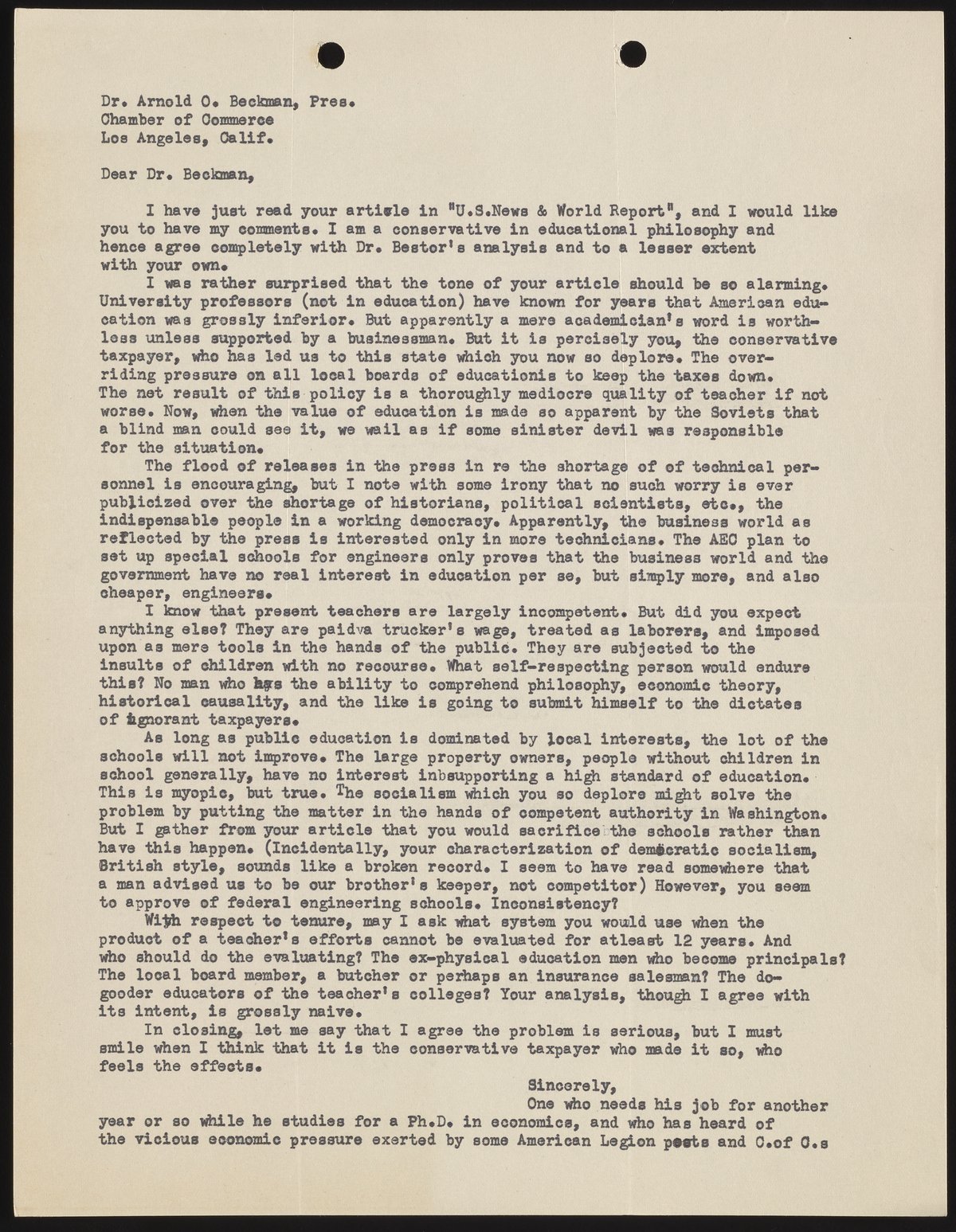 This is one of many letters written to Arnold Beckman in response to his comments on the topic of education. The writer expresses lukewarm agreement with Beckman’s U.S. News & World Report article, which he nonetheless characterizes as “grossly naive.” He expresses concern about low teaching salaries, the pressure to keep taxes low, and the persistent focus on technical education. The letter is signed “One who needs his job for another year or so while he studies for a Ph.D. in economics, and who has heard of the vicious economic pressure exerted by some American Legion posts and C. of C.s."