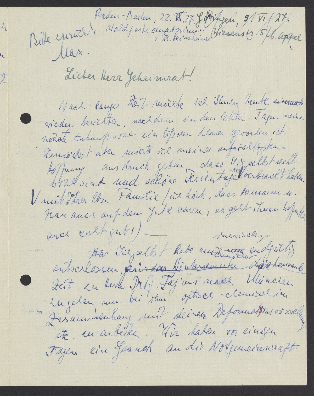 Letter draft from Max Bredig to Fritz Haber, June 1927