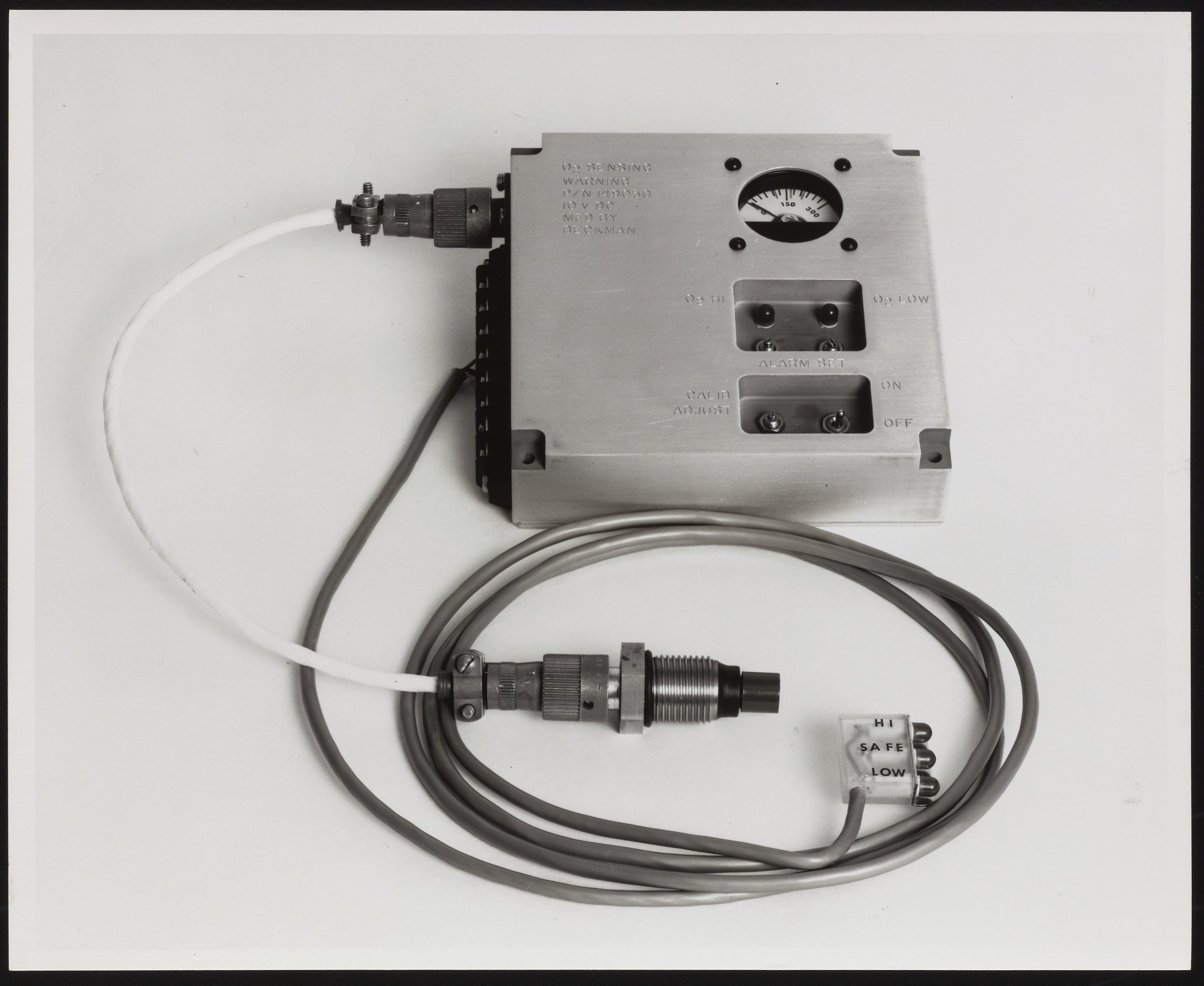 Designed under a 1968 contract for the U.S. Navy's Clothing and Textile Research Unit, Beckman's battery-operated oxygen sensing/warning device monitored the oxygen pressure in suits worn for fire fighting and damage control.