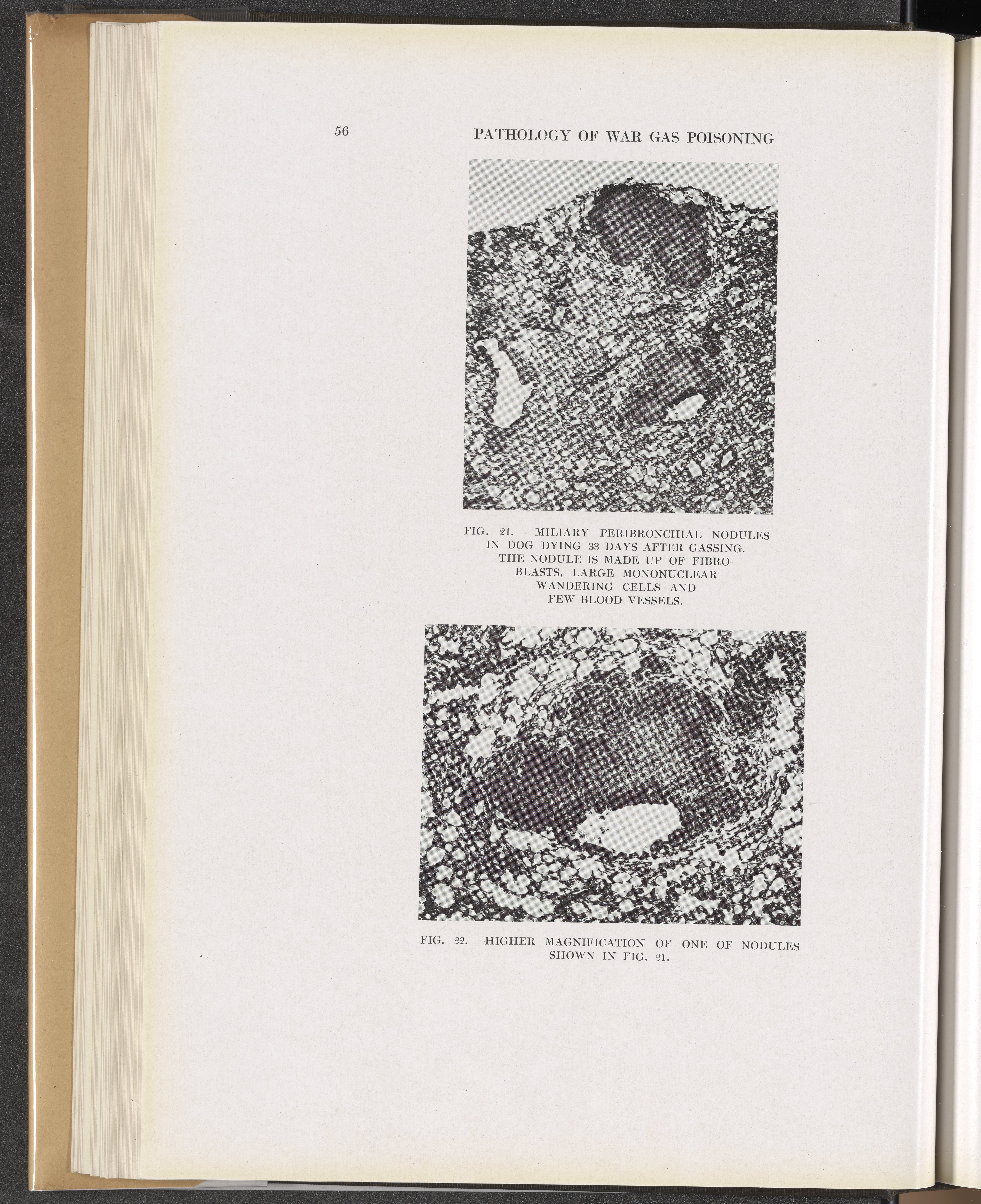 Winternitz, M. C. (Milton C.). “Fig. 21: Miliary Peribronchial Nodules in Dog Dying 33 Days after Gassing. Fig. 22: Higher Magnification of One of Nodules Shown in Fig. 21.” Collected Studies on the Pathology of War Gas Poisoning. New Haven, Connecticut: Yale University Press, 1920. https://digital.sciencehistory.org/works/tt44pm955.