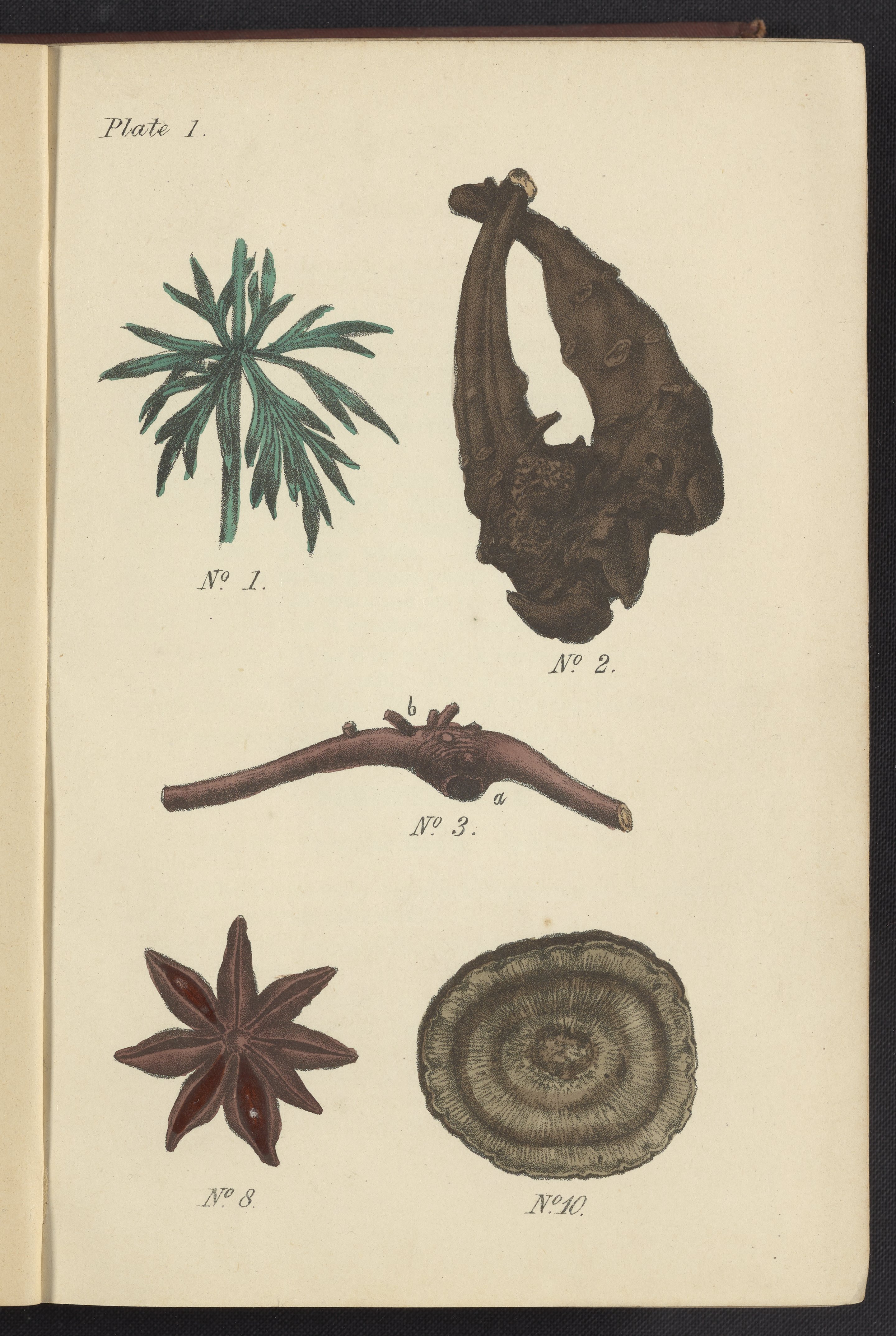 This manual identifies plants used for medicinal purposes. The focus is on plants that can be acquired through commerce in Britain and are illustrated as they would have been imported and bought, for example the opium is illustrated as a processed capsule wrapped in a poppy leaf instead of the poppy plant itself.