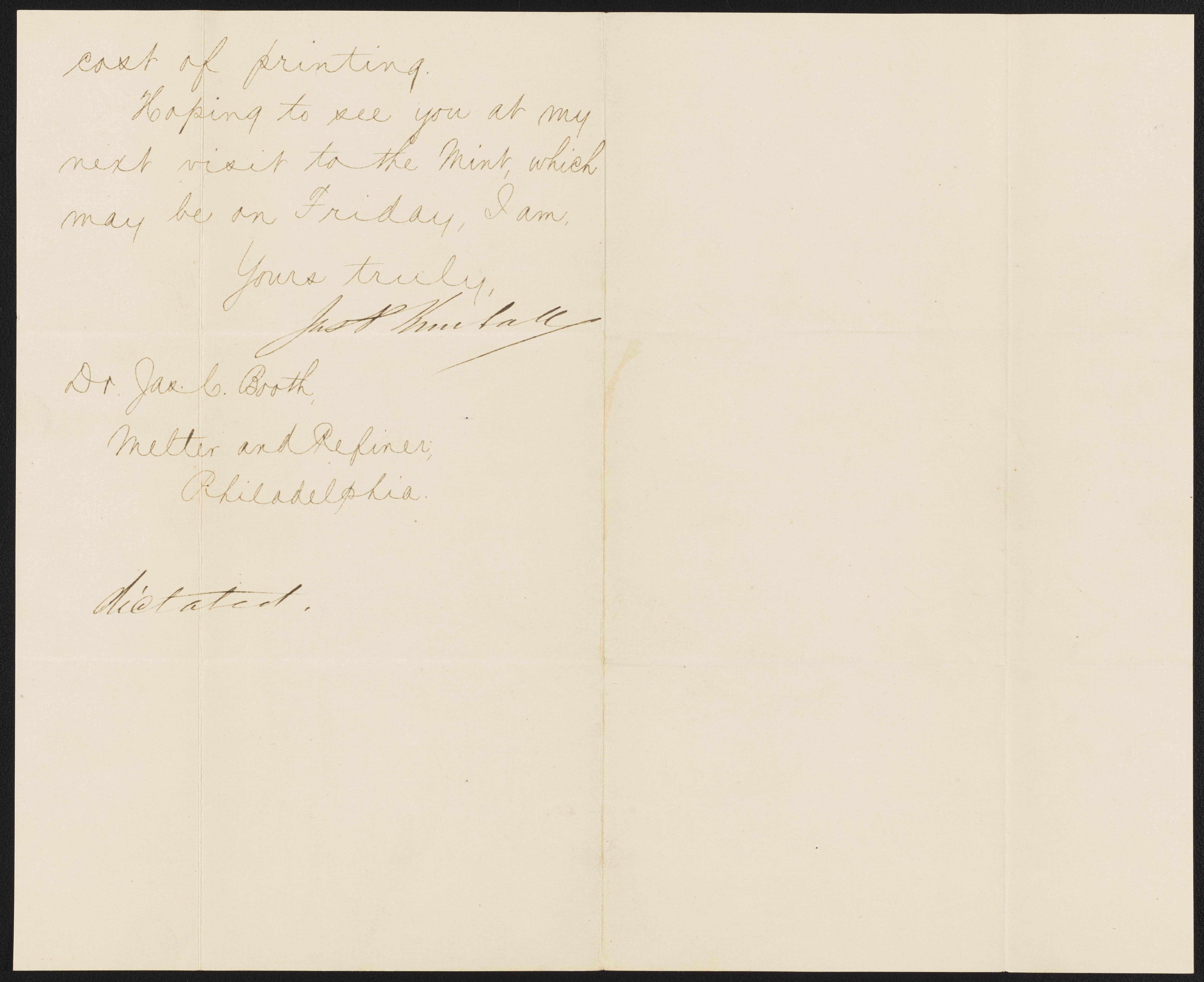 Small JPG1200 x 977px — 146 KBLarge JPG2880 x 2346px — 738 KBFull-sized JPG6414 x 5224px — 3.5 MBOriginal fileTIFF — 6414 x 5224px — 95.9 MBJames P. Kimball (1836-1913), metallurgist and geologist and Director of the United States Mint from 1885-1889, writes to James Curtis Booth (1810-1888) to solicit an article from Booth to appear in the annual report of the Bureau of the Mint.