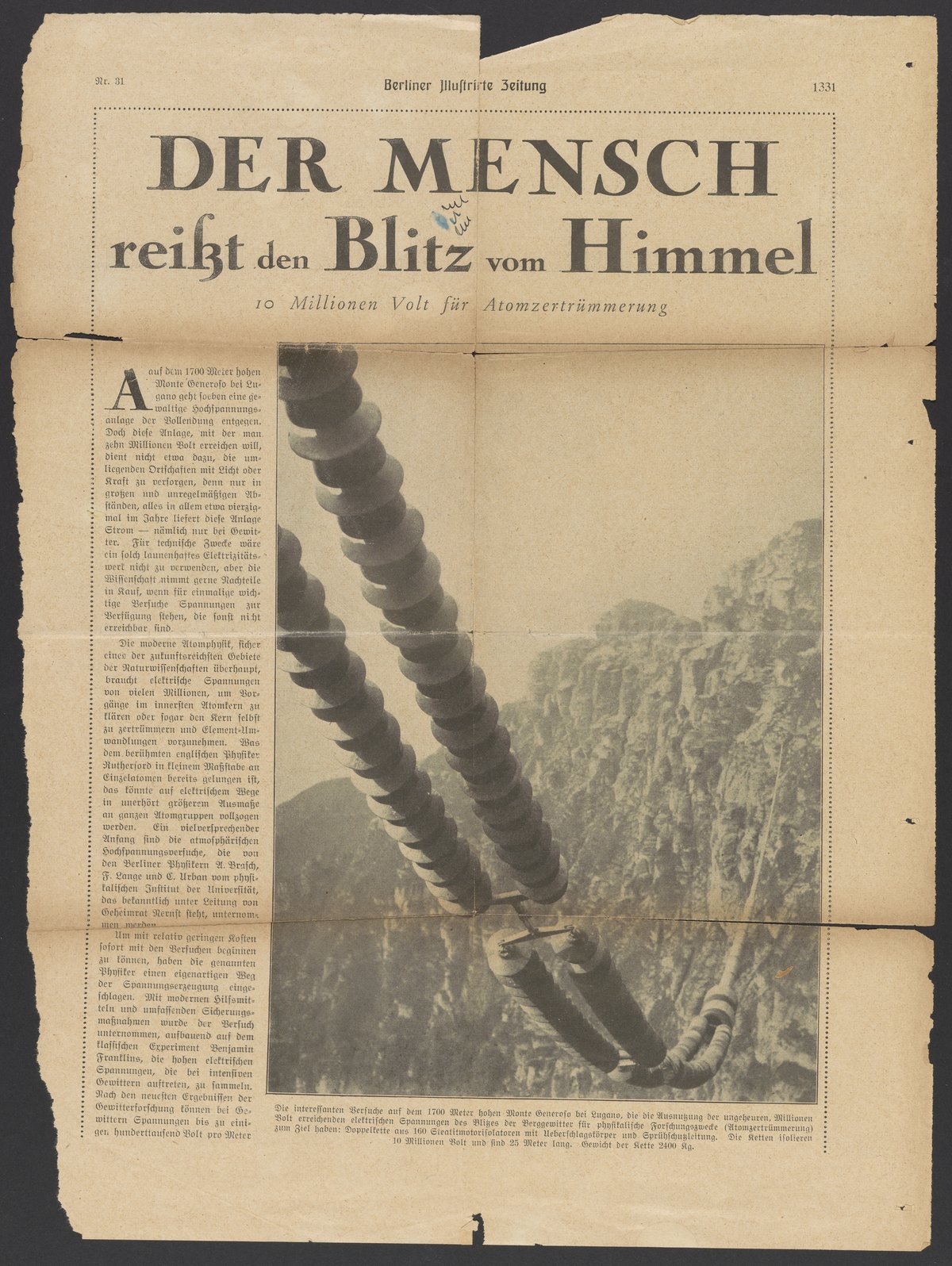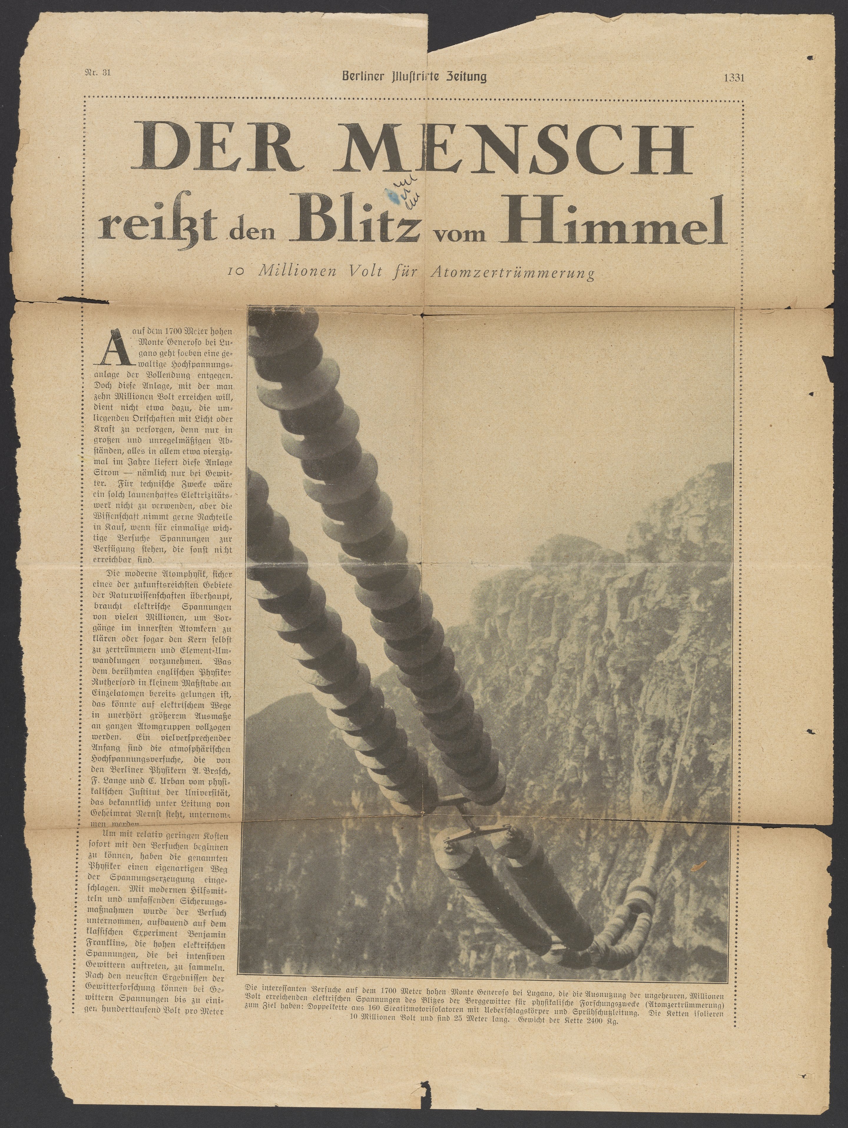 “Der Mensch Reißt Den Blitz Vom Himmel: 10 Millionen Volt Für Atomzertrümmerung.” Ullstein GmbH, n.d. Papers of Georg and Max Bredig, Box 4, Folder 13. Science History Institute. Philadelphia. https://digital.sciencehistory.org/works/tvavk4l.