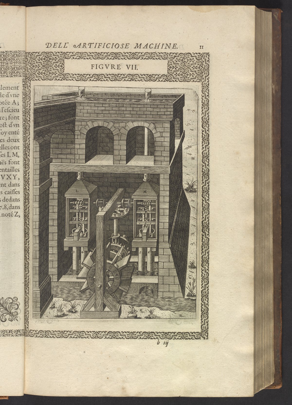 Ramelli, Agostino. “Plate 7: Device for Raising Water from a Low Place by River Current.” In Le Diverse Et Artificiose Machine Del Capitano Agostino Ramelli. Paris, France, 1588. https://digital.sciencehistory.org/works/tx31qh78r.