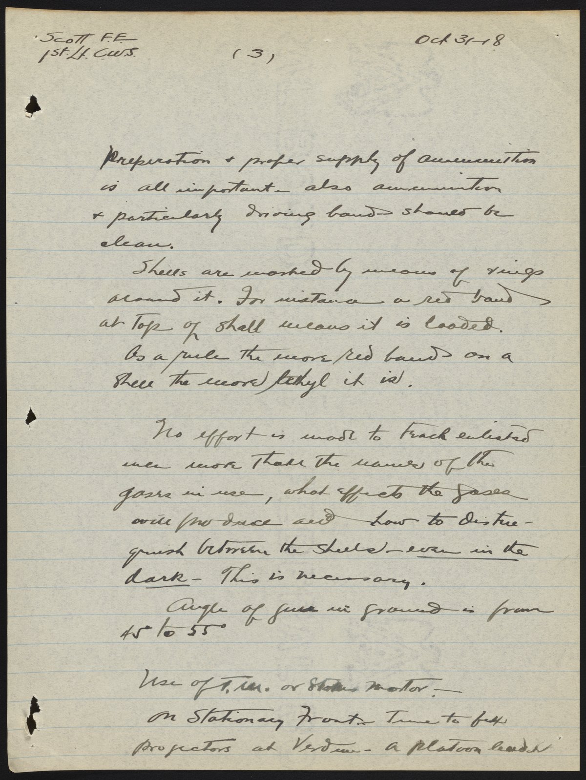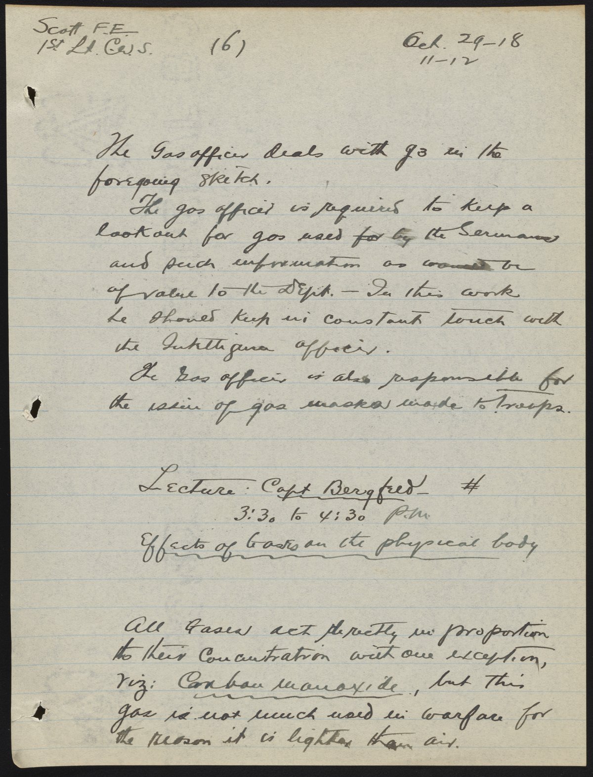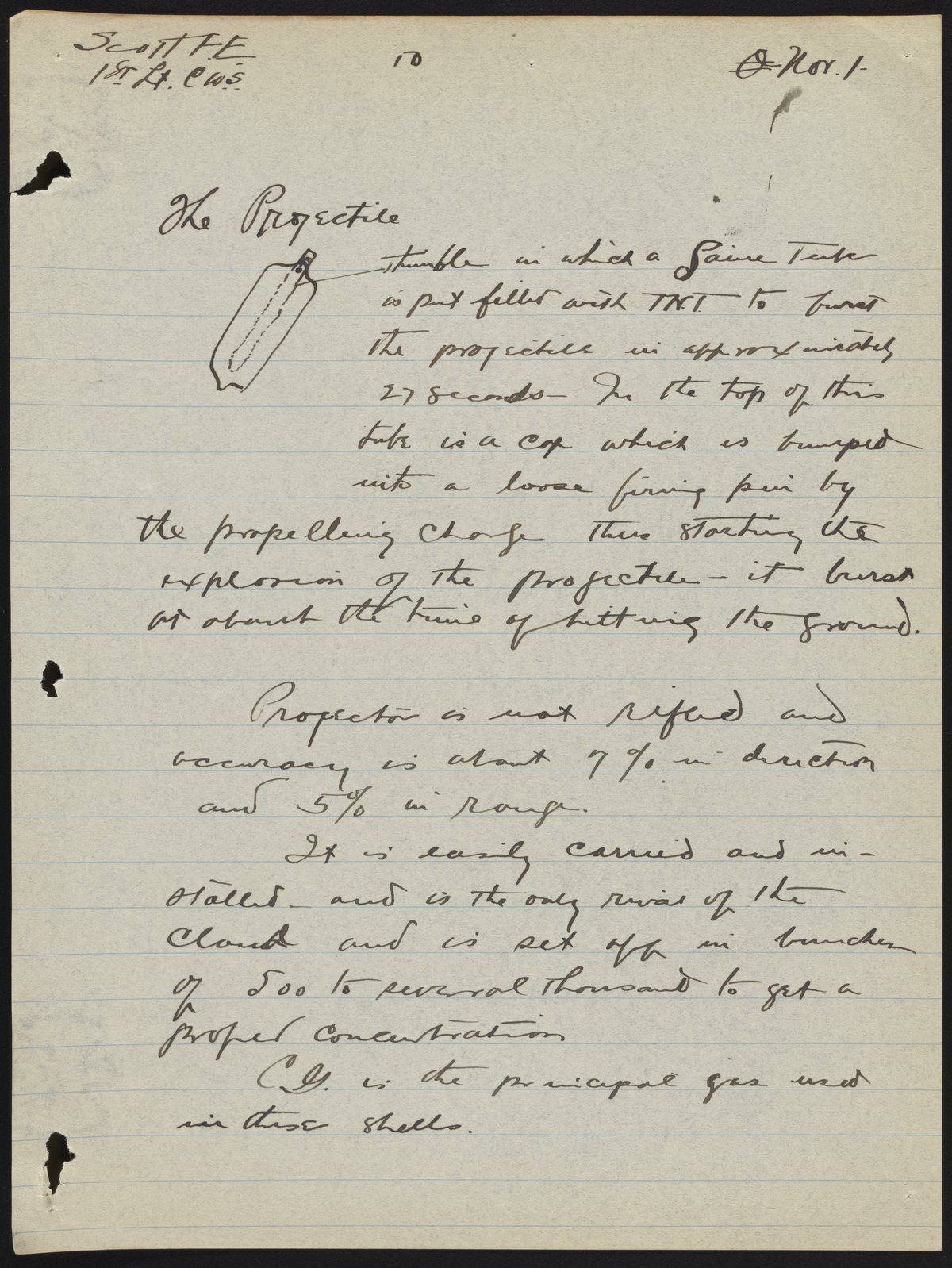Small JPG1200 x 1562px — 345 KBLarge JPG2880 x 3748px — 1.7 MBFull-sized JPG5302 x 6900px — 4.7 MBOriginal fileTIFF — 5302 x 6900px — 105 MBNotebook consists of handwritten notes taken by Francis E. Scott at the U.S. Army Gas School at Camp Kendrick, New Jersey, on the use of gas in warfare. The notes include teaching aids and a circular letter from Brigadier General Amos A. Fries, Chief of the Chemical Warfare Service, in which he discusses use of gas in trench warfare in France. Scott held the rank of 1st Lieutenant in the Army's Chemical Warfare Service during World War I.