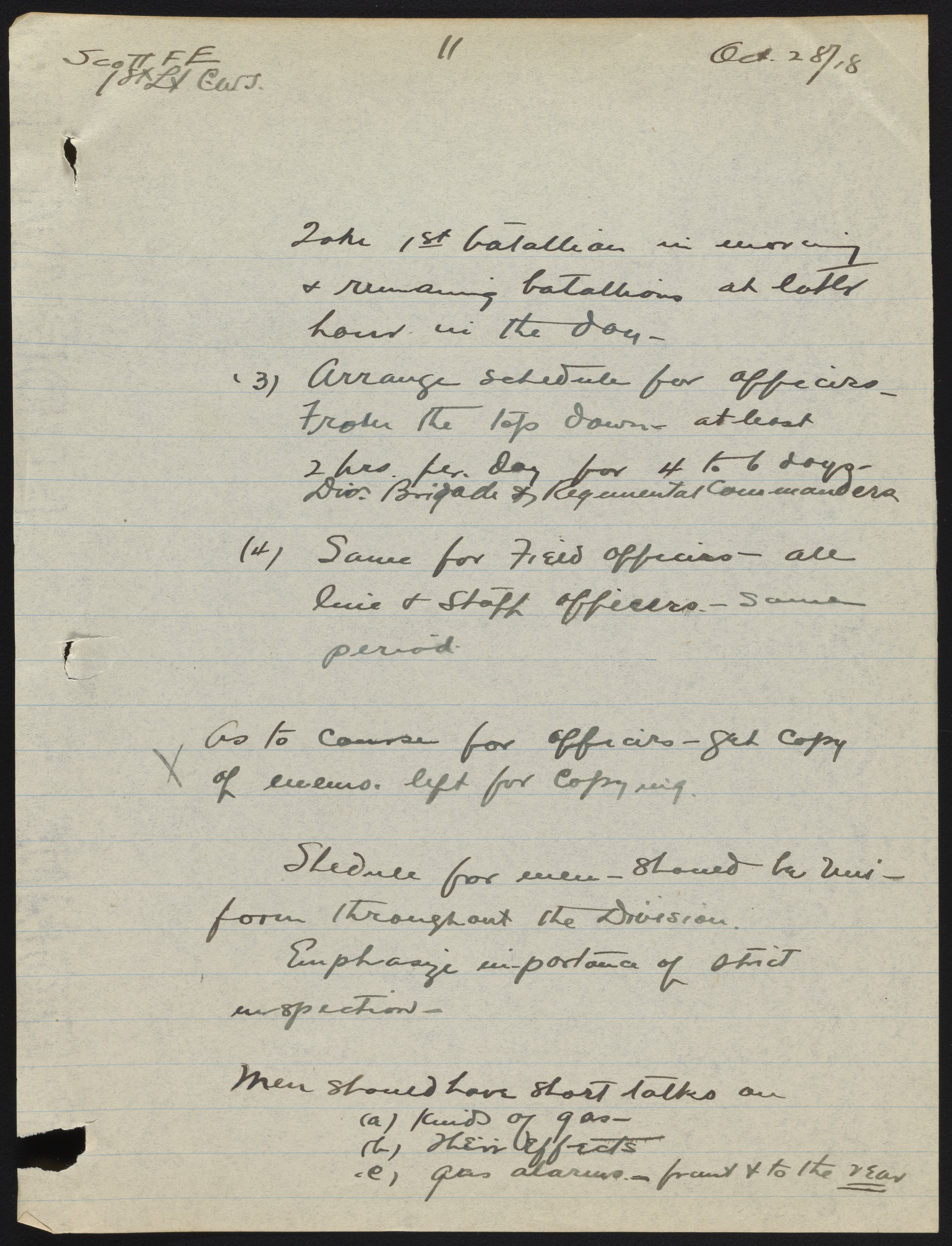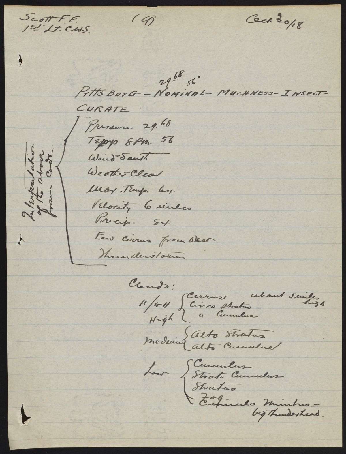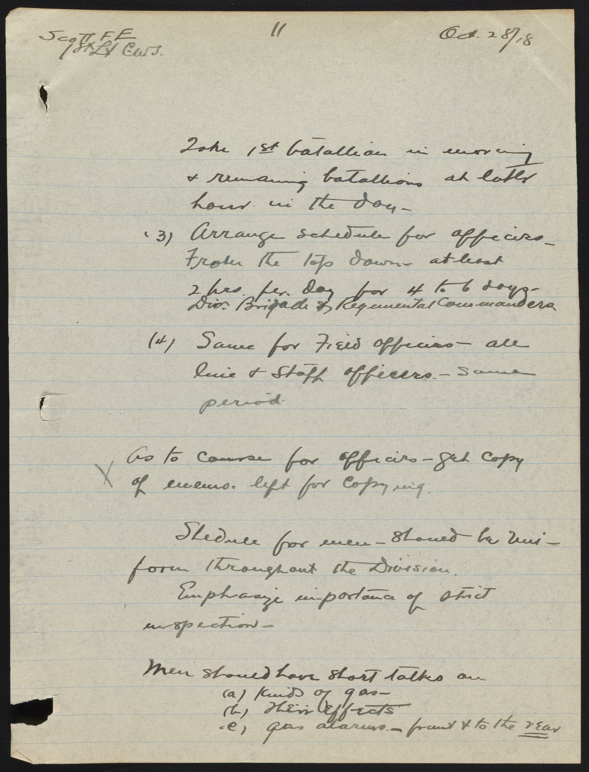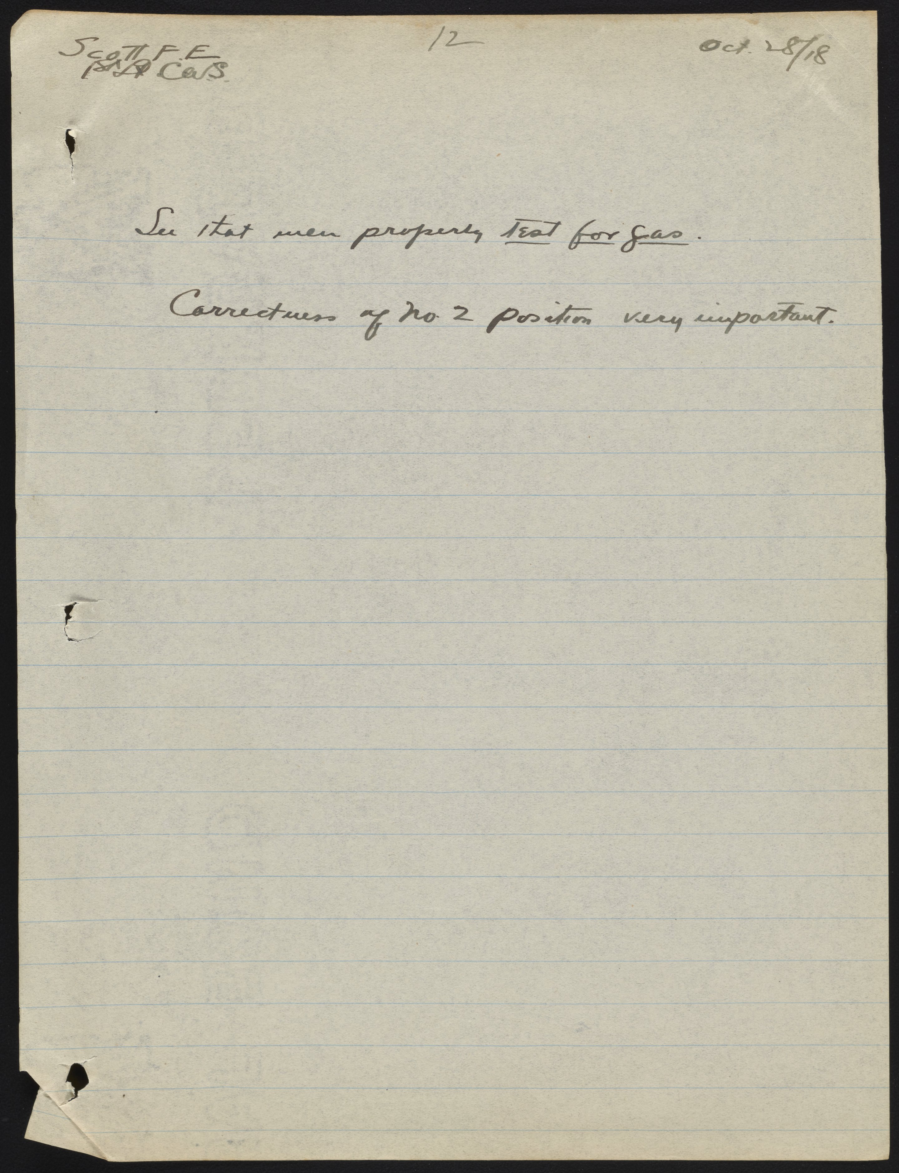 Small JPG1200 x 1562px — 345 KBLarge JPG2880 x 3748px — 1.7 MBFull-sized JPG5302 x 6900px — 4.7 MBOriginal fileTIFF — 5302 x 6900px — 105 MBNotebook consists of handwritten notes taken by Francis E. Scott at the U.S. Army Gas School at Camp Kendrick, New Jersey, on the use of gas in warfare. The notes include teaching aids and a circular letter from Brigadier General Amos A. Fries, Chief of the Chemical Warfare Service, in which he discusses use of gas in trench warfare in France. Scott held the rank of 1st Lieutenant in the Army's Chemical Warfare Service during World War I.