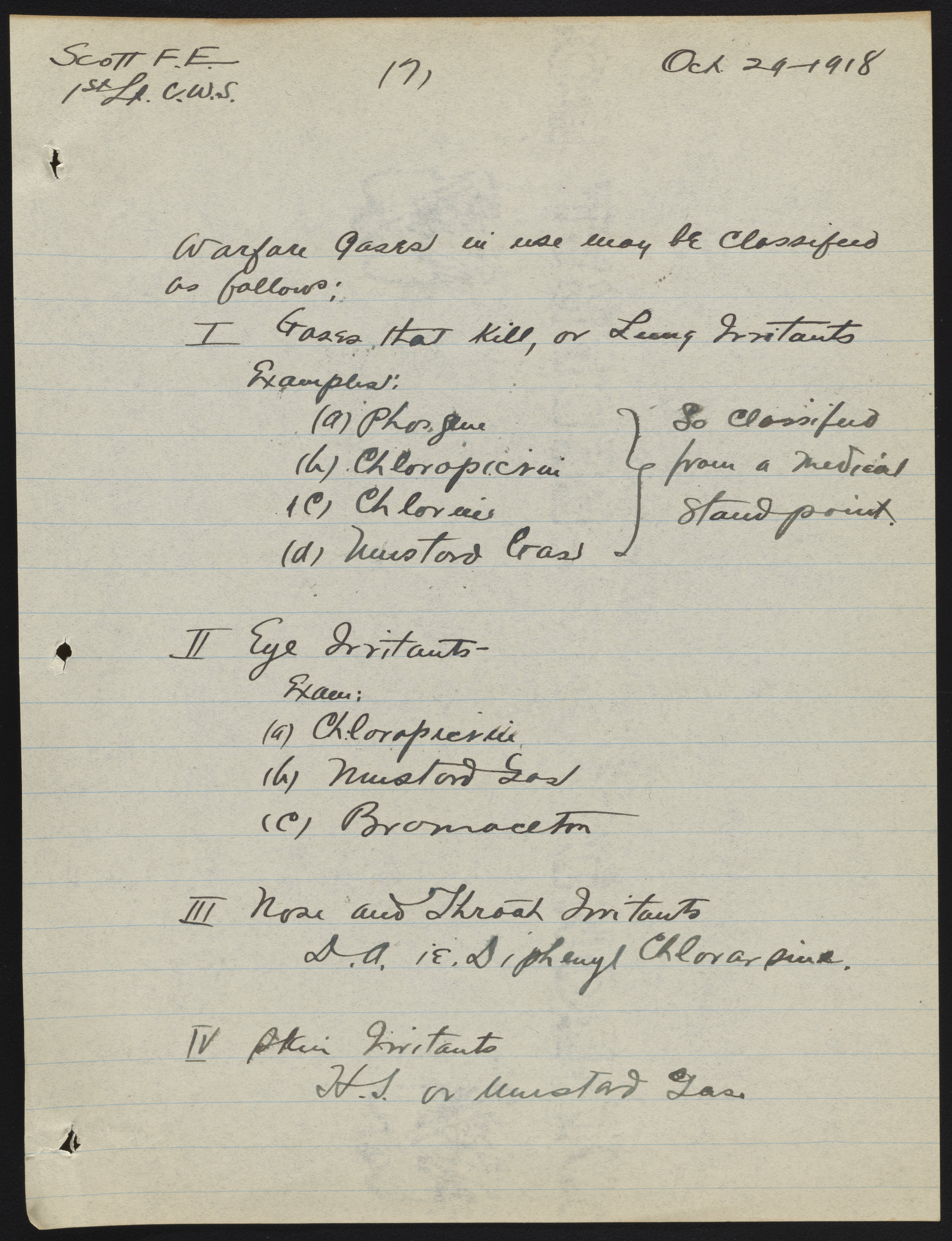 Scott, Francis E. “United States Army Gas School Course Notes,” 1918. Household and Organic Chemistry Course Notebooks. Science History Institute. Philadelphia. https://digital.sciencehistory.org/works/tx31qj045.