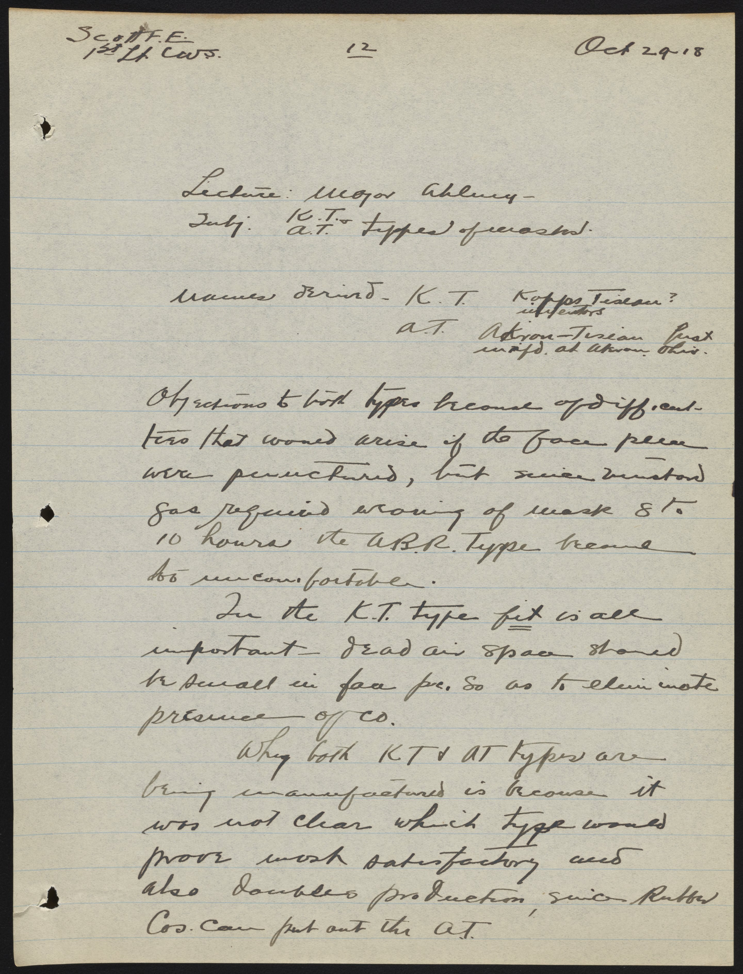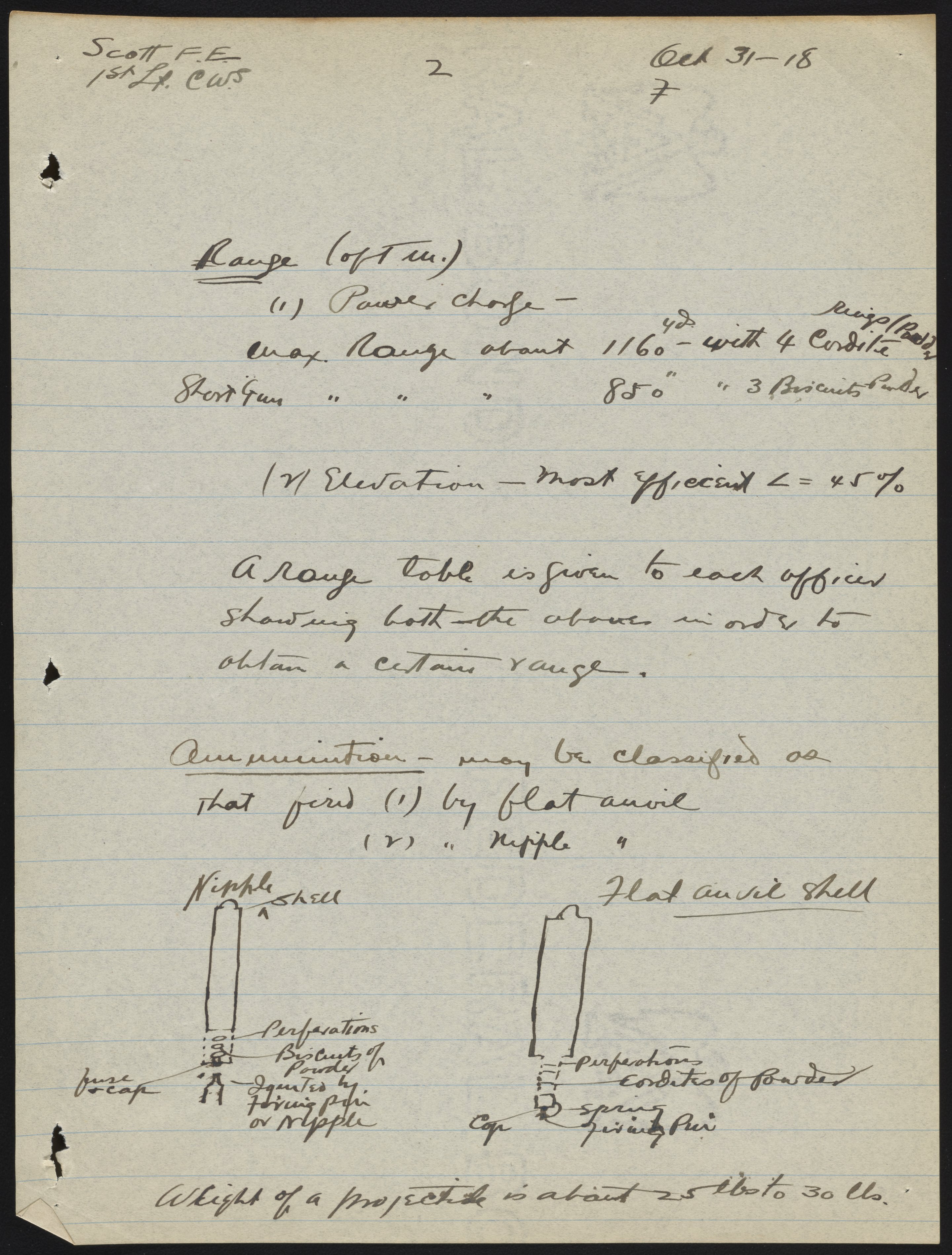 Small JPG1200 x 1562px — 345 KBLarge JPG2880 x 3748px — 1.7 MBFull-sized JPG5302 x 6900px — 4.7 MBOriginal fileTIFF — 5302 x 6900px — 105 MBNotebook consists of handwritten notes taken by Francis E. Scott at the U.S. Army Gas School at Camp Kendrick, New Jersey, on the use of gas in warfare. The notes include teaching aids and a circular letter from Brigadier General Amos A. Fries, Chief of the Chemical Warfare Service, in which he discusses use of gas in trench warfare in France. Scott held the rank of 1st Lieutenant in the Army's Chemical Warfare Service during World War I.