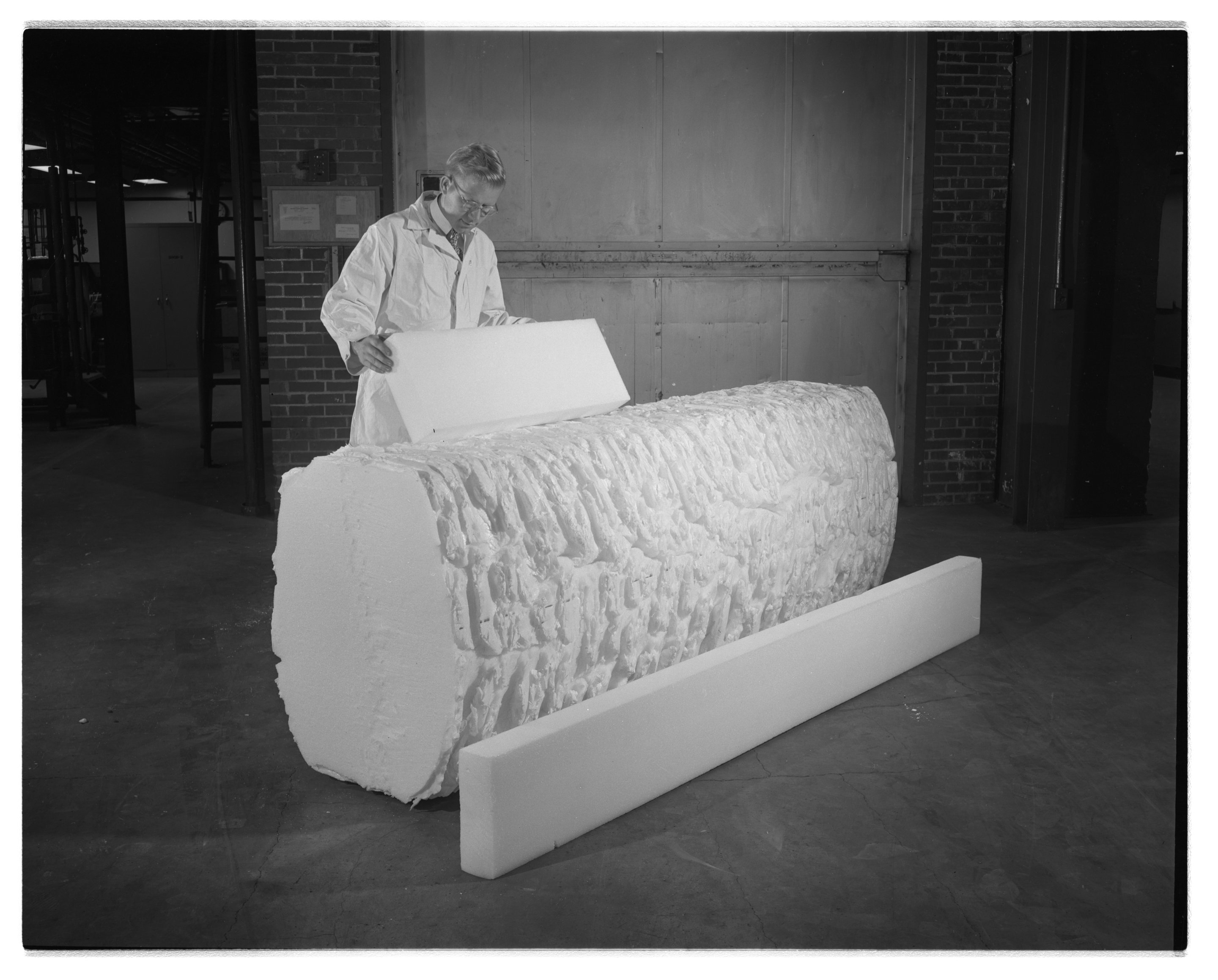 General view of an unidentified employee examining assorted pieces of Styrofoam at a Dow Chemical Company facility. Invented in 1941 by researchers in Dow's Chemical Physics Lab, "Styrofoam" properly refers to the Dow Chemical Company’s trademarked brand of closed-cell extruded polystyrene foam commonly used for thermal insulation and craft applications.