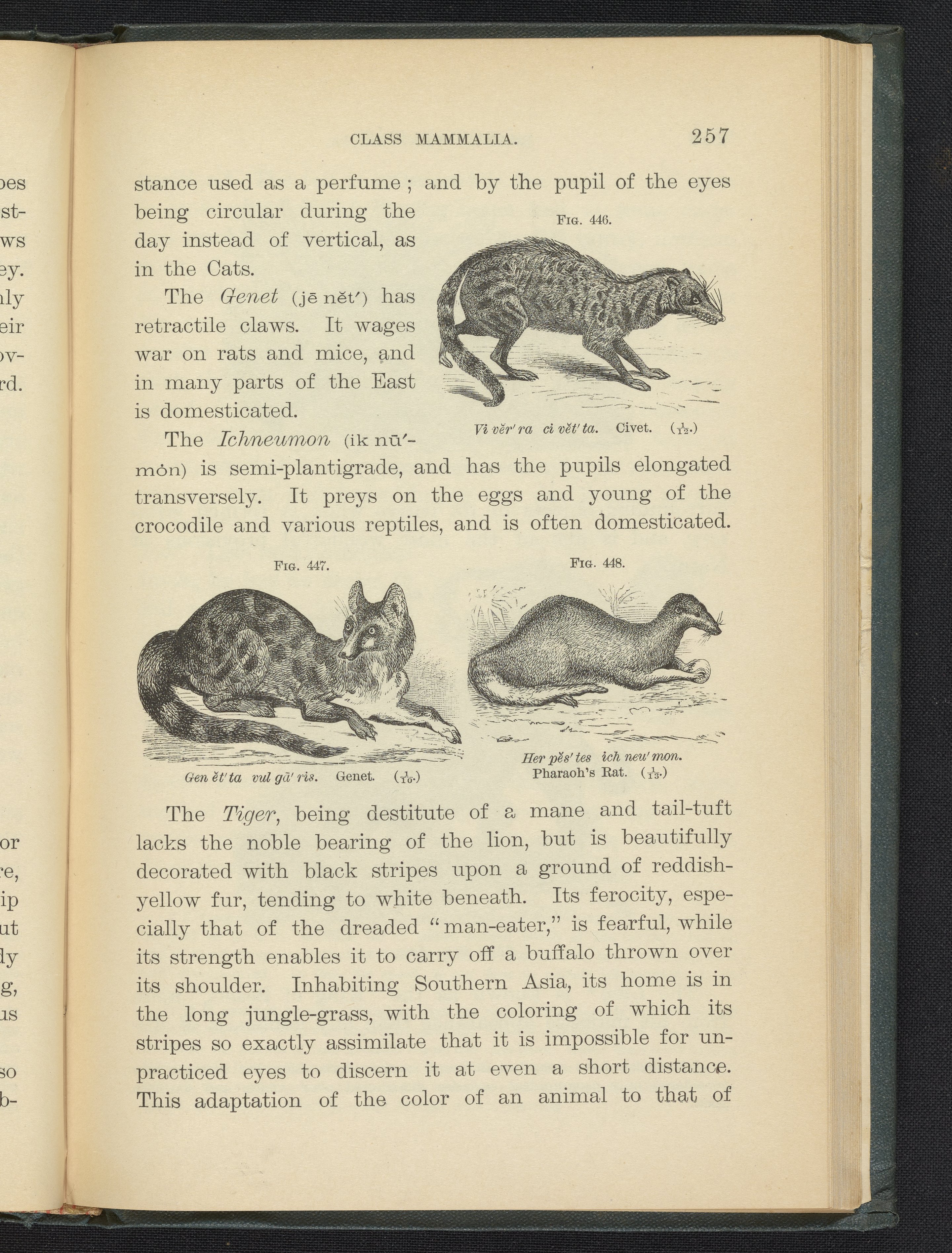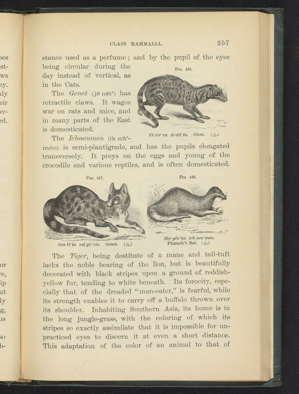Steele, Joel Dorman, and Jenks, J. W. P. (John Whipple Potter). “Figure 446. Civet. Figure 447. Genet. Figure 448. Pharaoh's Rat.” Popular Zoology. New York, New York: Chautauqua Press, 1887. https://digital.sciencehistory.org/works/txa2vwz.