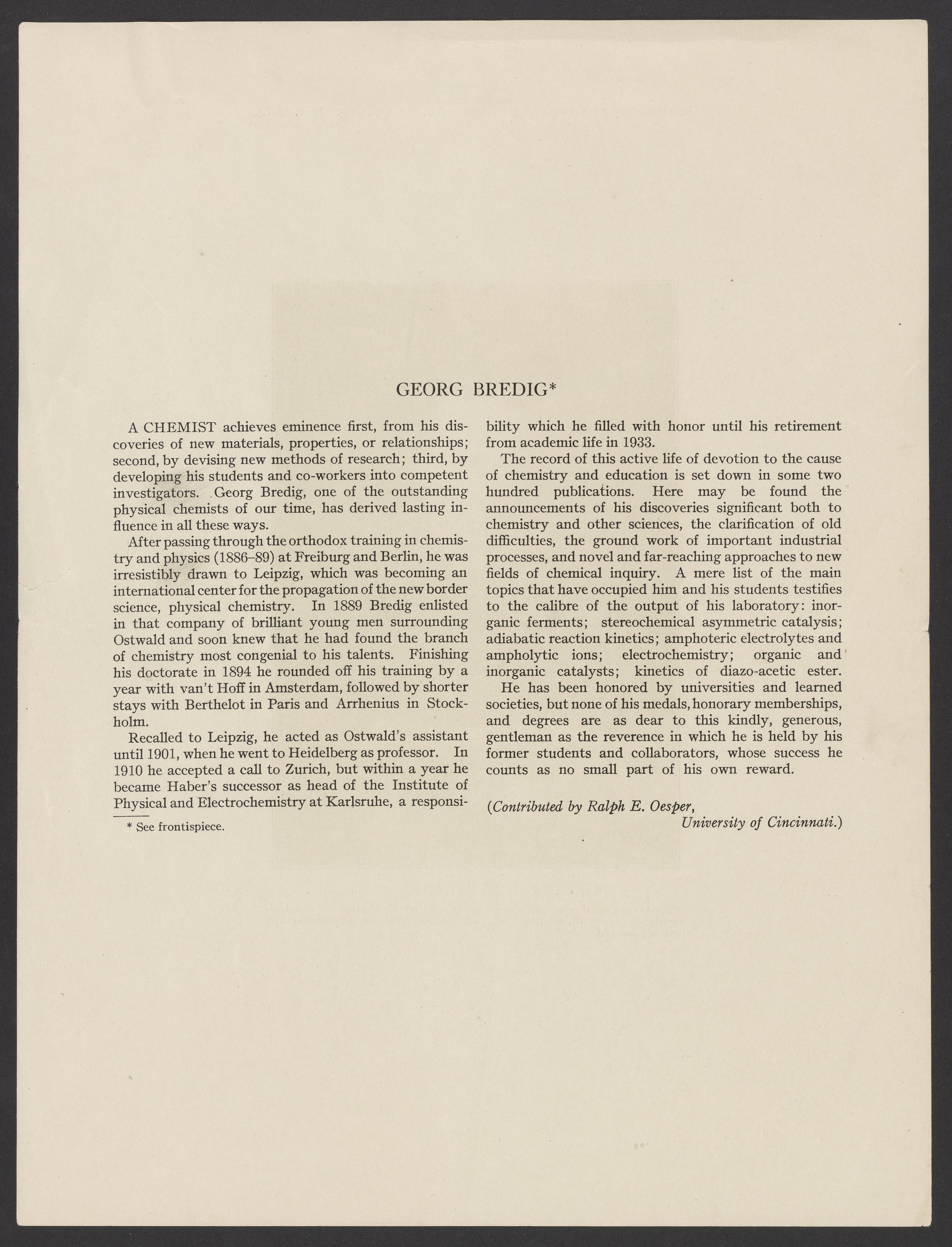 Oesper, Ralph E. (Ralph Edward). “Georg Bredig (1868- ).” American Chemical Society, June 1937. Papers of Georg and Max Bredig, Box 3, Folder 10. Science History Institute. Philadelphia. https://digital.sciencehistory.org/works/tyeplmz.