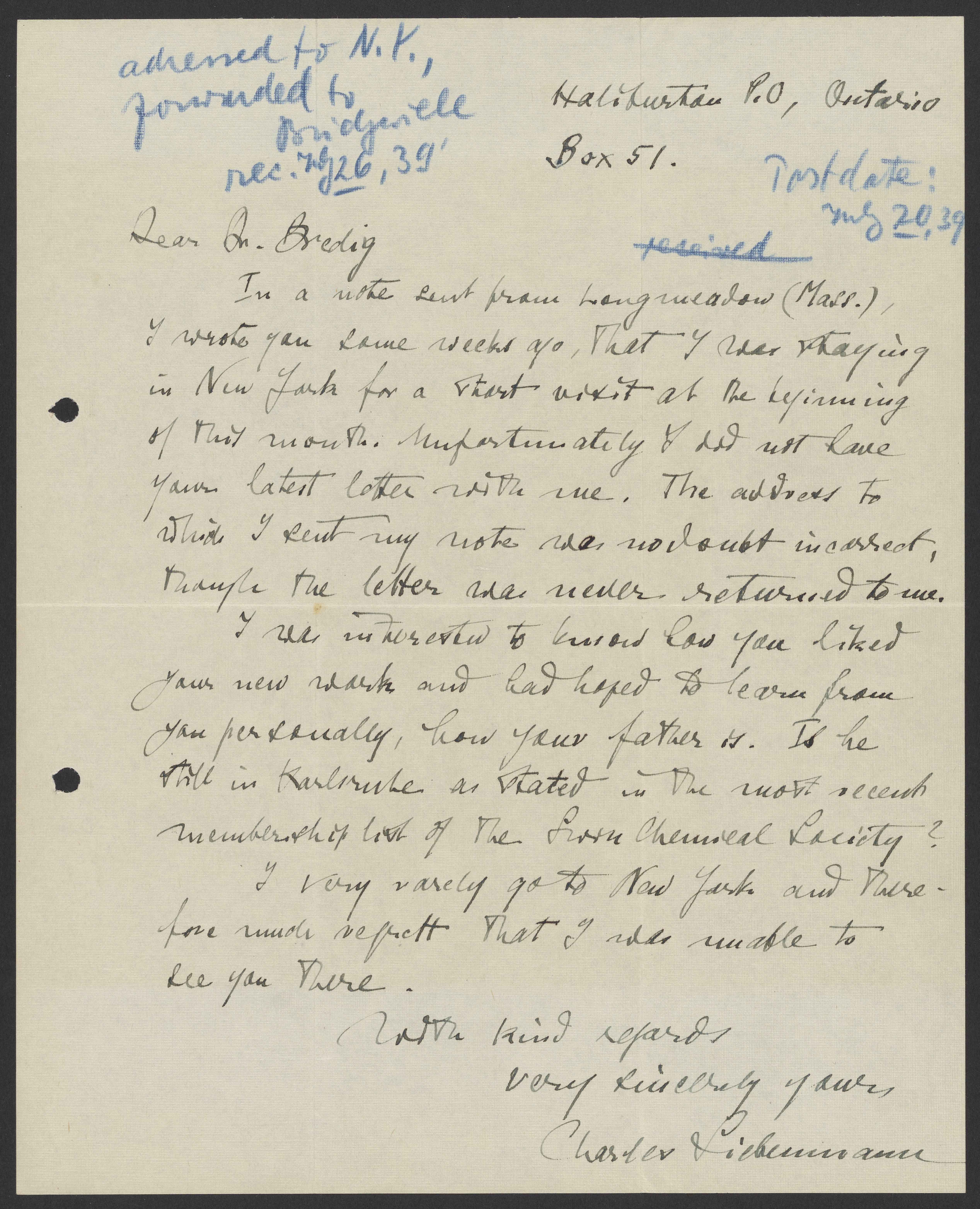 Siebenmann, Charles. “Letter from Charles Siebenmann to Max Bredig, August 20, 1939,” August 20, 1939. Papers of Georg and Max Bredig, Box 9, Folder 13. Science History Institute. Philadelphia. https://digital.sciencehistory.org/works/tz5ye4j.