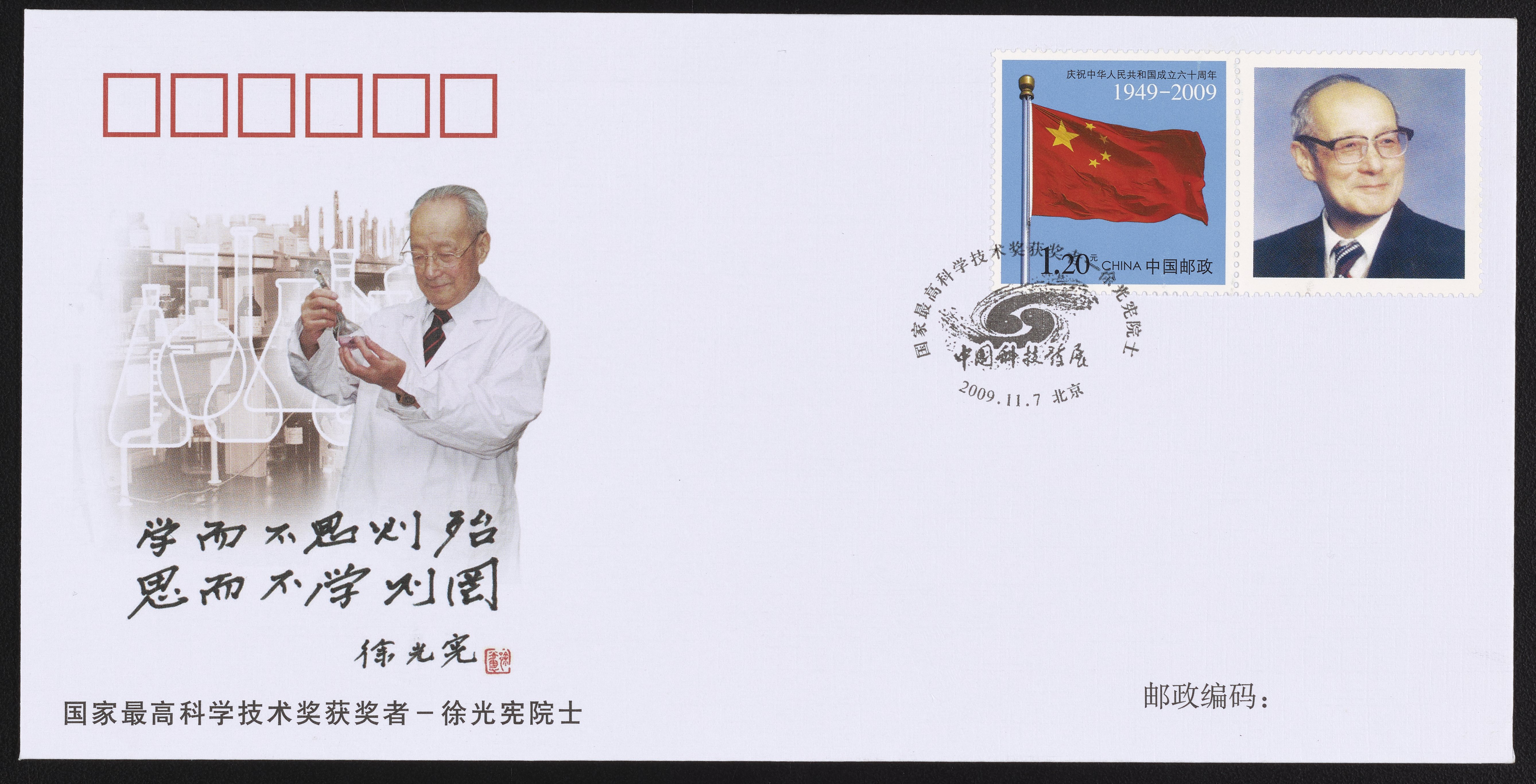 Cachet, postmark, and stamp depicting rare earth chemist Xu Guangxian (1920-2015). Xu, also known as Kwang-hsien Hsu, was a Chinese chemist who held various positions in the Department of Chemistry at Peking University. He was an academician of the Chinese Academy of Science respected for his contributions in both theoretical and experimental chemistry. He is a former president of the Chinese Chemical Society, and is known as "The Father of Chinese Rare Earths Chemistry."