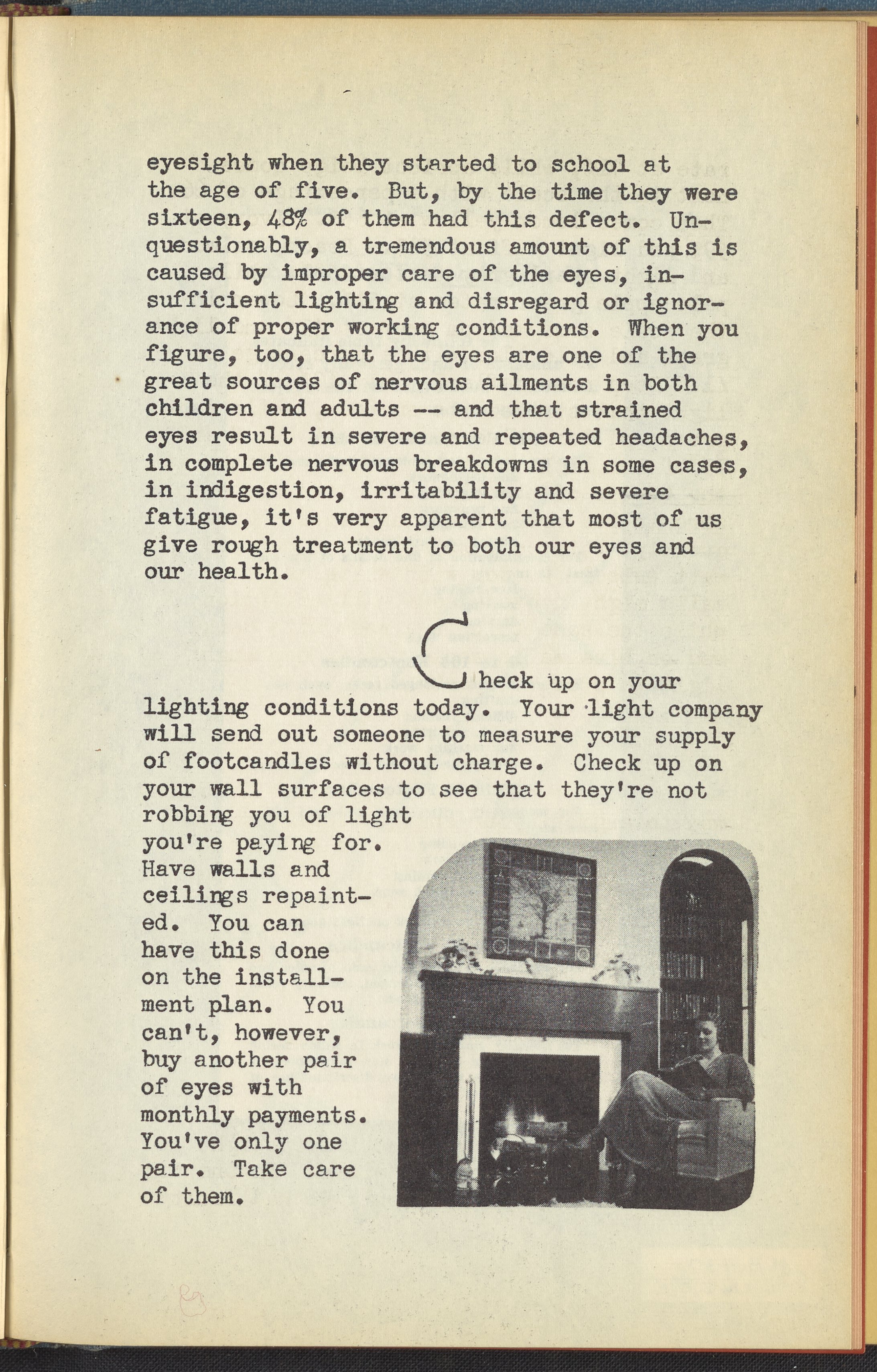 Booklet corresponding to a radio broadcast program created by the National Paint, Varnish, and Lacquer Association. The booklet describes how too much or too little light can be harmful to the eyes. Describes solutions for home lighting intended to soothe one's eyes. Encourages determining a gentle color scheme for one's home and using paint products that provide a balanced amount of light reflection. Includes small illustrations throughout and decorated covers.