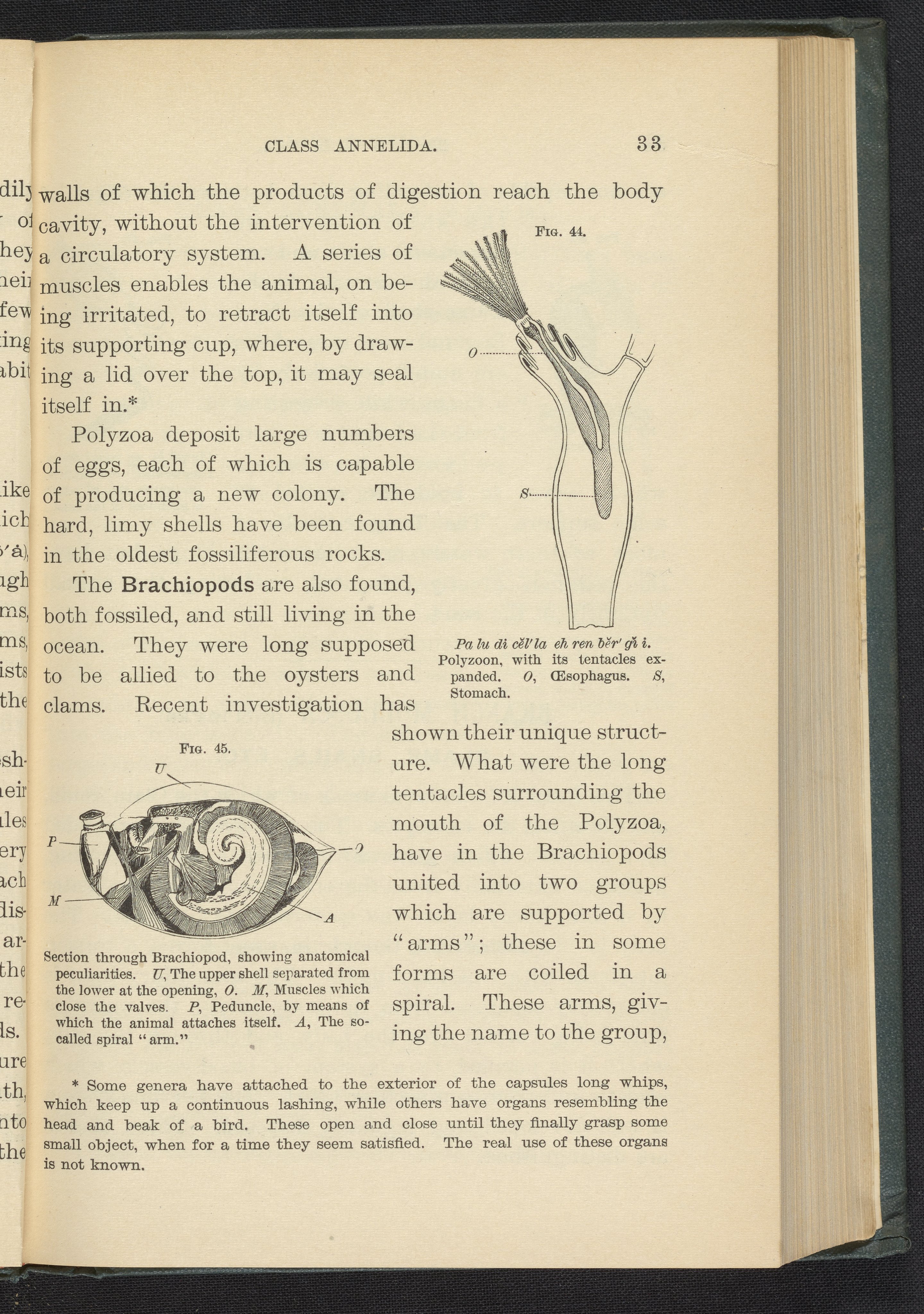 Figure 44 and 45 of the 1887 volume Popular Zoology. Figure 44 depicts a polyzoon with its tentacles expanded. Figure 45 depicts a cross-section view of a brachiopod, showing anatomical peculiarities.