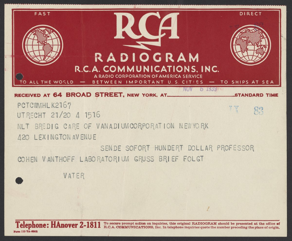 Radiogram from Georg Bredig to Max Bredig, November 5, 1939