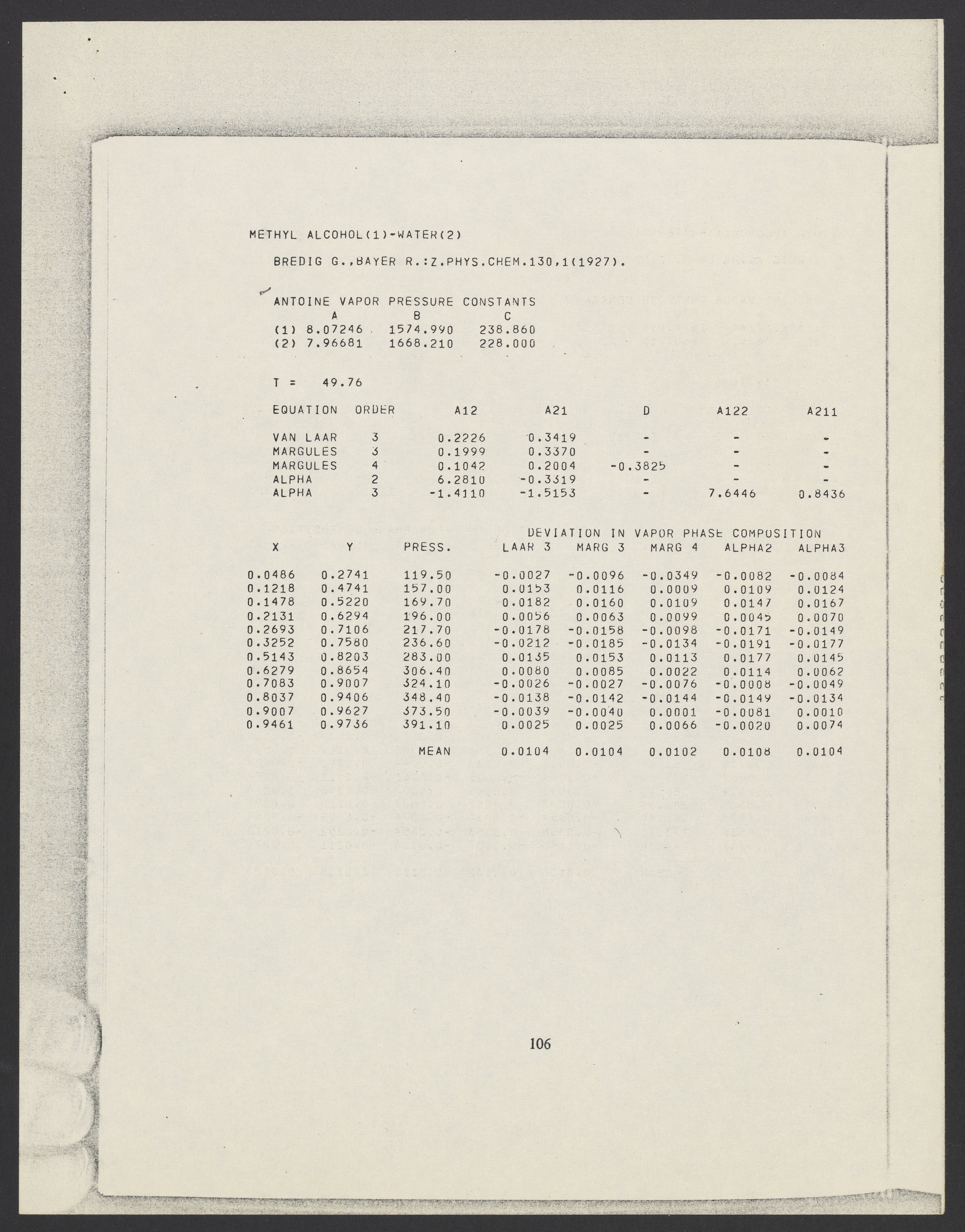 Small JPG1200 x 1530px — 185 KBLarge JPG2880 x 3672px — 1.3 MBFull-sized JPG5408 x 6896px — 4.9 MBOriginal fileTIFF — 5408 x 6896px — 107 MBPhotocopies of a selection of pages from a 1966 publication containing direct experimental data on vapor-liquid equilibrium in separation systems. The copies include datasets published in 1927 by Georg Bredig (1868-1944) and Richard Bayer (1883-1972) in their scientific paper Die Dampfdrücke des binären Systems Methylalkohol -Wasser in Zeitschrift für Physikalische Chemie, volume 130U, issue 1.