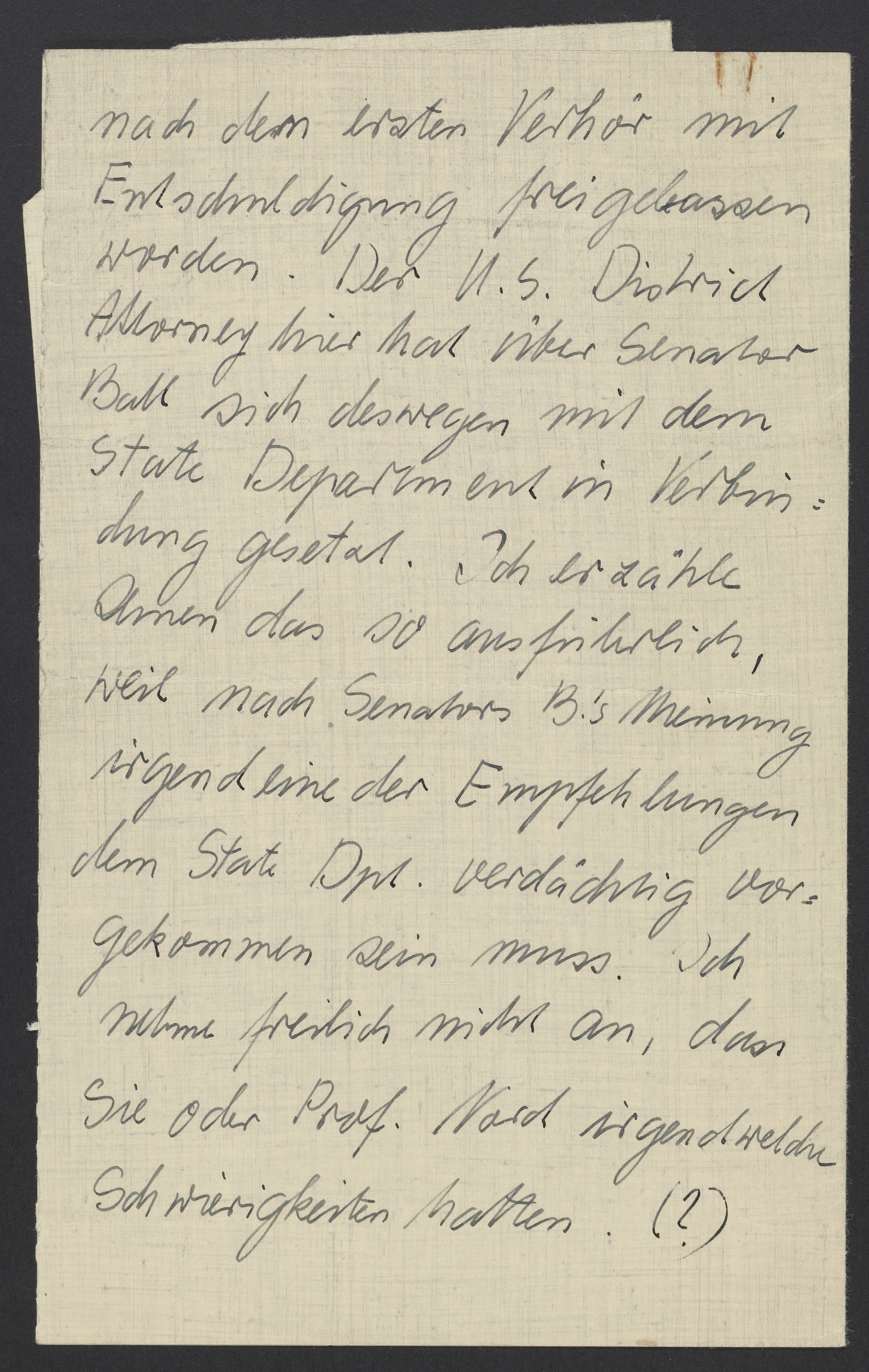 nach dem ersten Verhör mit Entschuldigung freigelassen worden. Der U.S. District Attorney hier hat über Senator Ball deswegen mit dem State Department ein Verhör durchgesetzt. Ich erzähle Ihnen das so ausführlich, weil nach Senator B.‘s Meinung irgendeine der Empfehlungen dem State Department verdächtig vorgekommen sein muss. Ich nehme freilich nicht an, dass Sie oder Prof. Nord irgendwelche Schwierigkeiten hatten (?).